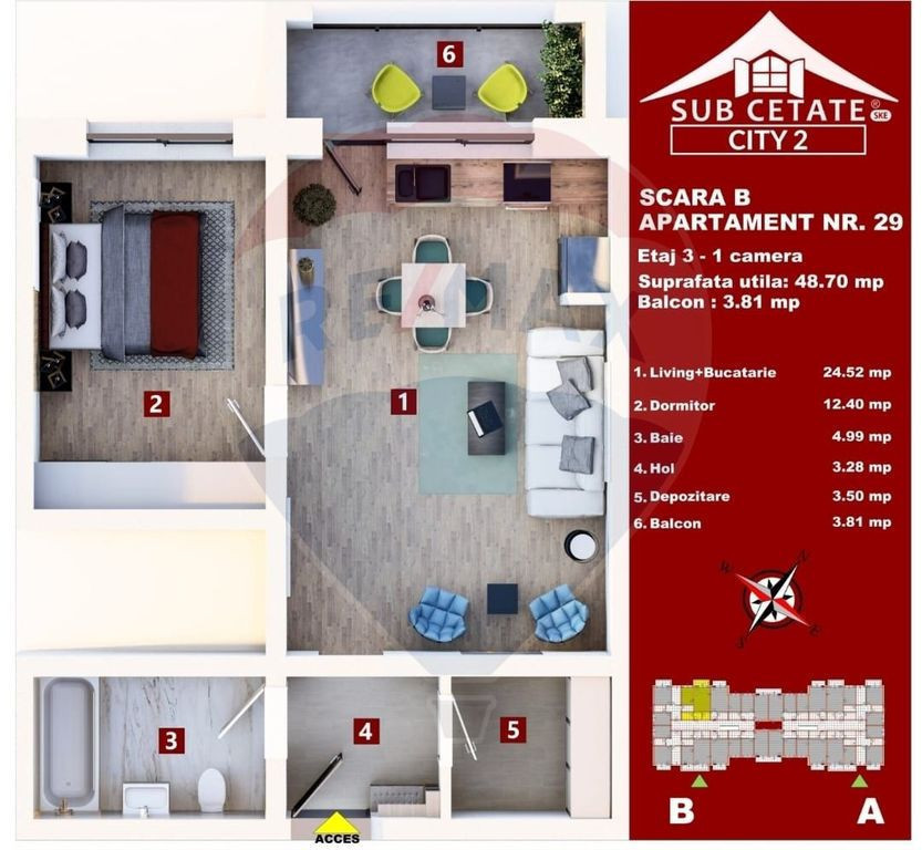 Apartament 2 camere nou – Subcetate City 2 | Sânpetru – Brașov | Intabulat Feb 2026 Dacă îți dorești un apartament într-o zonă liniștită, aproape de Brașov, acesta poate fi alegerea potrivită. Se oferă spre vânzare apartament modern de 2 camere, 49 mp utili, situat în ansamblul rezidențial Subcetate City 2 – Sânpetru, una dintre zonele cu cea mai rapidă dezvoltare din apropierea Brașovului. Apartamentul se află în Vila 6 și beneficiază de vedere către parc, oferind un cadru plăcut și mai multă liniște. Localizare foarte bună: - aproximativ 3 minute până la Coresi Shopping Center - aproximativ 10 minute până în centrul Brașovului - acces rapid către centura ocolitoare Complex modern, gândit pentru confort: Ansamblul Subcetate City 2 oferă un mediu plăcut și aerisit, cu priveliște către munți și spații verzi generoase. În interiorul complexului se regăsesc sau sunt în dezvoltare: - parc mare pentru relaxare și plimbări - locuri de joacă pentru copii - grădiniță - magazine și servicii - transport în comun - infrastructură completă (drumuri asfaltate și utilități) Apartamentul se predă la cheie, cu finisaje realizate peste standardul dezvoltatorului. Dispune de încălzire în pardoseală și centrală proprie pe gaz, oferind un plus de confort și eficiență energetică. Compartimentarea este modernă și practică, iar spațiul poate fi amenajat ușor în funcție de stilul și preferințele viitorului proprietar. ???? Datorită poziționării într-o zonă cu cerere ridicată, apartamentul este ideal atât pentru locuit, cât și pentru investiție (închiriere pe termen lung). ???? Intabulare realizată în februarie 2026 ???? Locul de parcare nu este inclus în preț ???? Fotografiile sunt cu titlu informativ(momentan se fac ultimele retusuri) Pentru detalii suplimentare sau programarea unei vizionări, vă stăm cu plăcere la dispoziție.