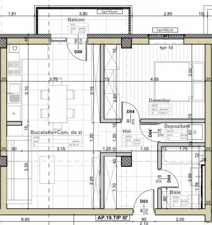 Apartament 2 camere 49,52 mp, et.2/2, balcon 4,5 mp, Apahida.