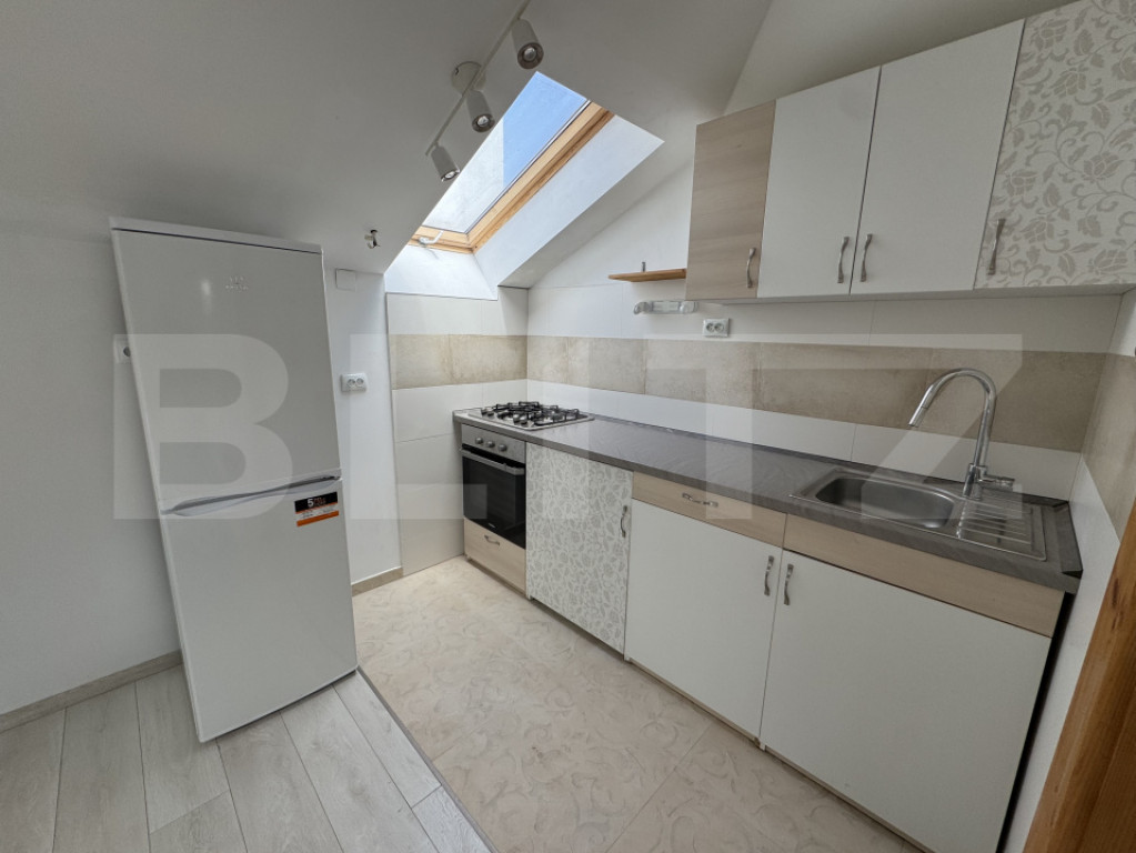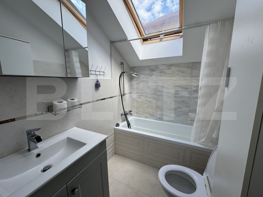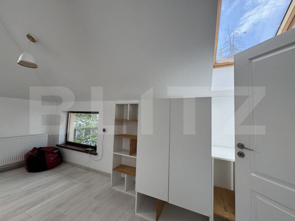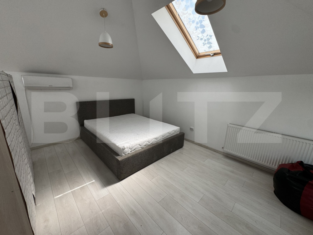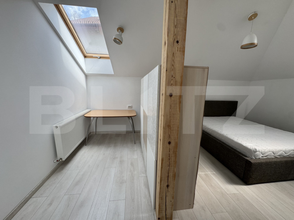Blitz oferă spre închiriere un apartament inedit, situat la casă, în cartierul Gheorgheni, cu o suprafață utilă de 60 mp, potrivit pentru cei care caută un spațiu bine compartimentat, aerisit, luminos și liniștit. Imobilul este compus din două apartamente, iar accesul se face separat, de la parter. Locuința este dispusă la etajul 1 și este organizată eficient în două camere: un living cu bucătărie open space, complet mobilată și utilată, și un dormitor care include și o zonă de birou. Apartamentul dispune de aer condiționat în dormitor și centrală termică proprie, oferind un confort sporit și costuri reduse de întreținere. În plus, proprietatea beneficiază de un loc de parcare în curte, destinat unei mașini de dimensiuni mici. Cod ofertă / ID BLITZ: P169796 Id intern: P169796
