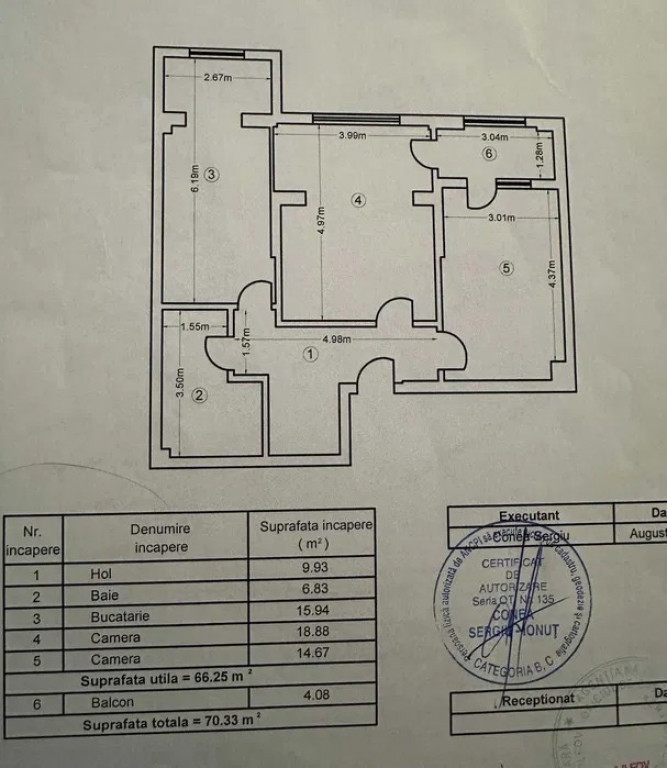 Se oferă spre vânzare un apartament de 2 camere, decomandat, cu o suprafață utilă de 66,25 mp la care se adaugă un balcon de 4,08 mp, totalizând 70,33 mp, situat la parterul unui bloc cu 4 etaje. Compartimentarea este practică și eficientă, apartamentul fiind alcătuit din: - Hol generos – 9,93 mp, care asigură acces facil către toate încăperile - Living spațios – 18,88 mp - Dormitor luminos – 14,67 mp - Bucătărie mare – 15,94 mp, separată - Baie – 6,83 mp - Balcon – 4,08 mp Dotări și avantaje: - Centrală termică proprie - Finisaje: gresie, faianță, parchet - Canalizare și toate utilitățile racordate - Cadastru și intabulare efectuate - Loc de parcare inclus Apartamentul se vinde semimobilat, este disponibil imediat și reprezintă o alegere sigură pentru cei care își doresc un spațiu confortabil, într-o zonă liniștită și civilizată. Pentru detalii și programarea unei vizionări, sunați la numărul de telefon din anunț.