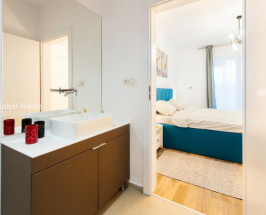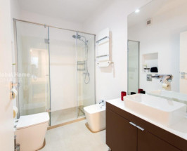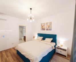Dormitorul oferă un spațiu intim și confortabil, fiind complet mobilat și beneficiind de multiple spații de depozitare. Apartamentul dispune de două băi moderne, amenajate cu finisaje premium și obiecte sanitare de calitate.