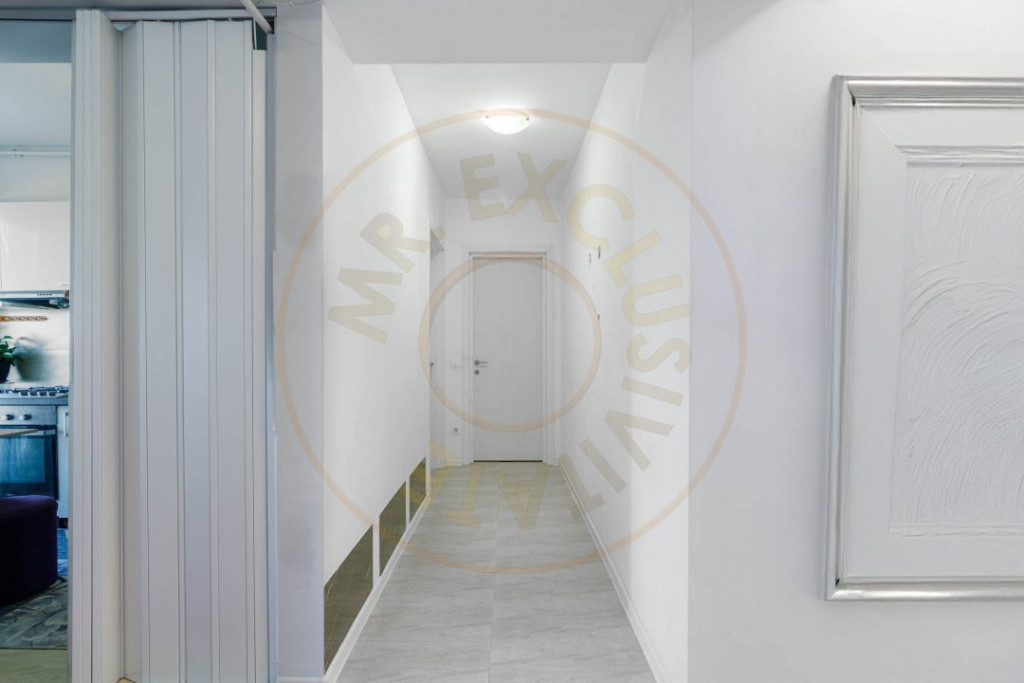 În partea dreaptă se află bucătăria închisă, complet mobilată și utilată, gândită pentru funcționalitate maximă. Continuând pe holul secundar, ajungi la zona de noapte: dormitorul, luminos datorită geamurilor mari din tavan până în podea și cu o suprafață de 13,65 mp, și baia, dotată cu cadă și aerisire prin ventilație.