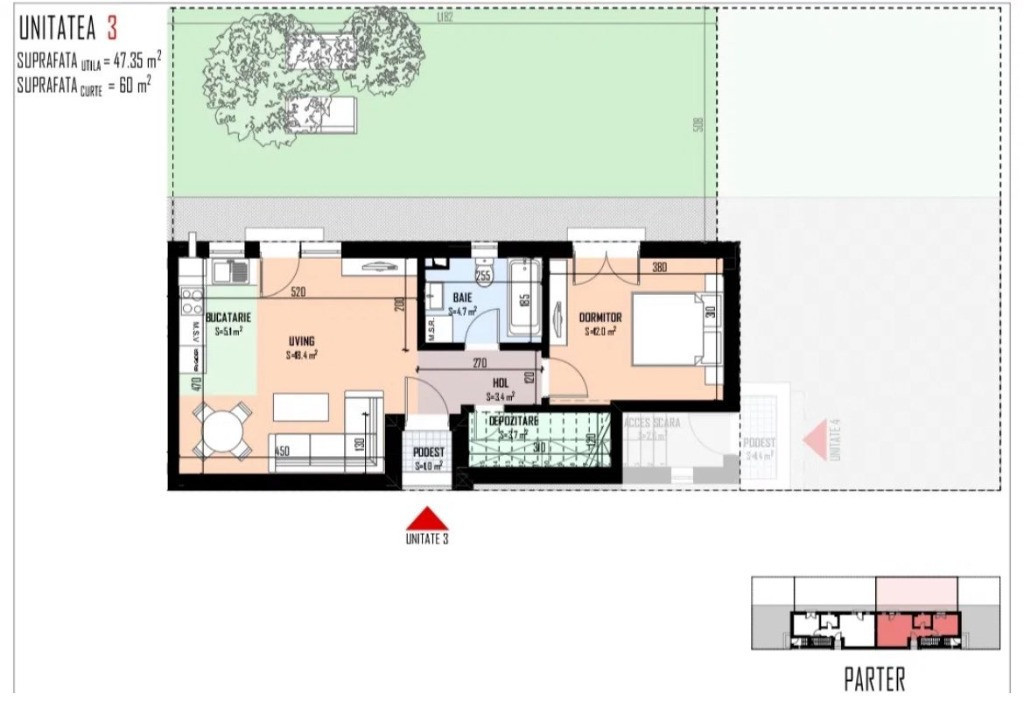 De vânzare apartament cu 2 camere cu o suprafața utilă de 47.35 mp, curte cadastrată de 60 mp și 2 locuri de parcare. Se predă la GATA, finisajele interioare sunt la alegerea clientului. Apartamentul dispune de încălzire prin pardoseală, centrală termică Ariston, tâmplărie Rehau cu sticlă tripan. Izolatia fonica intre apartamente este formata din caramida 25 cm grosime + tencuiala mecanizata + rigips fonic montat pe ambele parti ale zidariei (la peretii comuni intre apartamente). Apartamentul are o poziție foarte bună, în imediata apropiere regăsim stație de autobuz, magazine, restaurante, școală gimnazială, grădinița pentru copii, toate la maxim 5 minute de mers pe jos. Complexul este racordat la toate utilitatile publice ale orașului (gaze, electricitate, apa/canal , fibra optica). Preț vânzare: 75.900 + TVA 9%, apartament, curte și 2 locuri de parcare, incluse în preț. Pentru mai multe detalii și vizionari vă rog să mă contactați la numărul de telefon 0764905111 - Eusebiu
