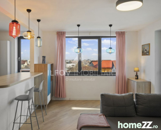 Situat la etajul 3/3 si avand o suprafața totala de 59,4 mp si suprafata util 55,4 mp, balcoane închise cu geamuri glisante și plase de țânțari tip plisé. Locuința se remarcă prin finisaje premium și dotări complete, incluzând uși Filomuro, încălzire în pardoseală, aer condiționat, dressing, bucătărie mobilată și utilată complet cu electrocasnice (frigider incorporat, masina de spalat vase incorporata, cuptor cu plita inductie/gaz si hota), baie echipată cu mașină de spălat și uscător.