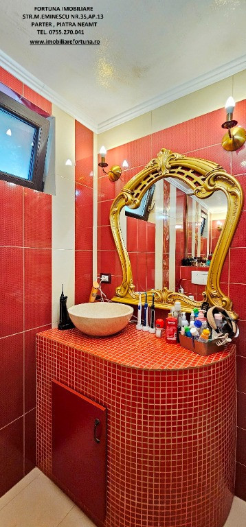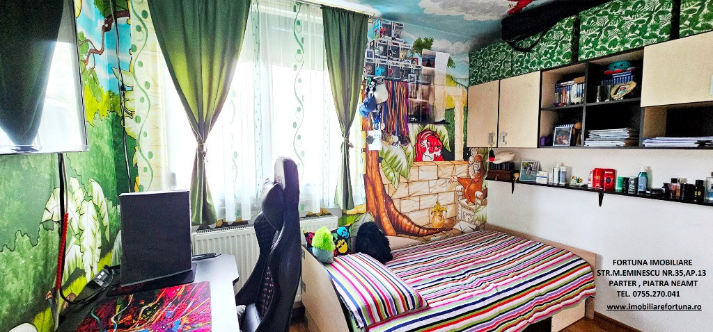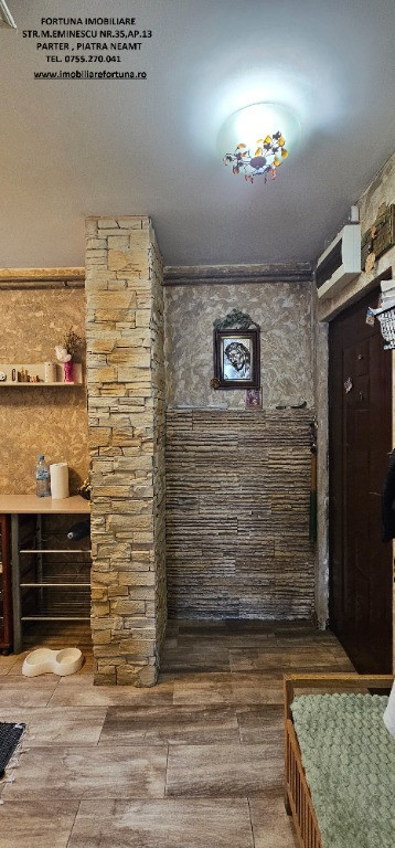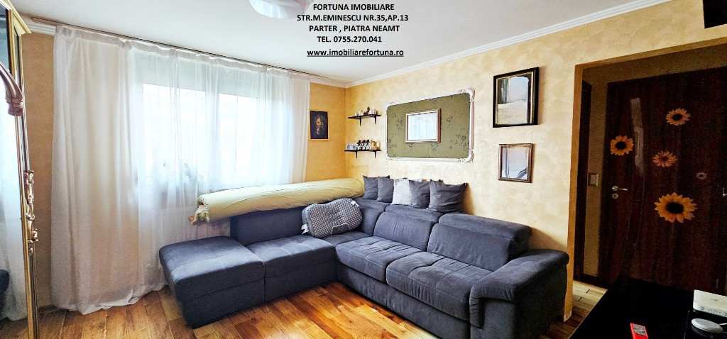 APARTAMENT 2 CAMERE, DĂRMĂNEȘTI, COCHET ȘI ÎNGRIJIT, 53.000 EURO, SAU SCHIMB CU APARTAMENT 3 CAMERE – SE OFERĂ DIFERENȚĂ Dacă sunteți în căutarea unui imobil pentru locuit sau pentru o investiție imobiliară, FORTUNA IMOBILIARE vă propune spre achiziție acest apartament cu 2 camere, cu o structură semidecomandată, ce răspunde tuturor categoriilor de vârstă, amplasat la parter înalt, într-un bloc cu 4 etaje, construit în anul 1975, din cartierul Dărmănești, Aleea Ulmilor. Apartamentul cu suprafața utilă de 36,76 mp (suprafața construită 44,20 mp), are orientare EST, poziționare pe mijloc, termosistem exterior, fiind luminos și călduros. Este compus din bucătărie, 2 holuri (unul transformat în dressing și camera centralei), baie generoasă cu aerisire naturală, cameră de zi și dormitor. Este prevăzut cu ușă antiefracție, acces controlat prin interfon, centrală termică ARISTON, gresie, faianță, parchet laminat, uși interioare pe comandă, geamuri termopan reflexive cu 5 camere, stoluri exterioare din aluminiu acționate din interior. Apartamentul a fost renovat integral, având instalațiile termică/electrică/ sanitară noi, înainte de montarea parchetului s-a turnat șapă autonivelantă, iar scurgerea este separată. Se află în proximitatea unor obiective de interes din Municipiul Piatra Neamț (Piața Dărmănești – Complexul ADRIDAN și PROFI, Centrul Teritorial de Învățământ Deschis la Distanță, Grădinița nr. 2 a Colegiului Național Pedagogic și alte centre educaționale, recreative, medicale). În fața blocului sunt 2 parcări disponibile. Se vinde semimobilat (bucătăria echipată integral, inclusiv electrocasnice și mare parte din mobilierul din camere). Preț 53.000 euro, sau schimb cu apartament 3 camere plus diferență. Pentru o prezentare detaliată a acestei oferte, furnizarea unor informații suplimentare referitoare la situația juridică / identificarea imobilului și programarea unei vizionări, vă invităm la sediul nostru, Fortuna Imobiliare, situat in Piatra Neamț, str. M. Eminescu, nr. 35, ap. 13, parter, jud. Neamț, lângă fostul Tribunal, tel. contact 0755.270.041. Your comfort is our priority ! Oferta noastră completă o găsiți aici: https://imobiliarefortuna.ro/