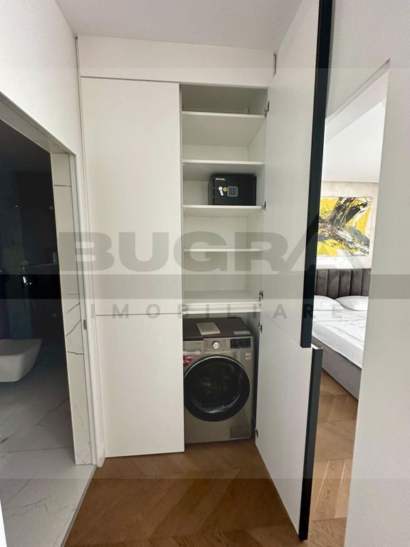 Bugra Imobiliare va ofera spre inchiriere un apartament de 2 camere, mobilat si utilat de lux, dotat cu finisaje si materiale premium, situat la etajul 2 al unui imobil nou construit de 5 etaje, eficient termic. Apartamentul are o compartimentare moderna, gandita astfel: living cu bucatarie spatios, dormitor matrimonial, baie, terasa. Proprietatea are dotari premium din care enumeram: 2 aparate de aer conditionat Daikin, incalizre in pardoseala, masina de spalat vase. Imobilul se afla in apropierea mijloacelor de transport in comun, supermarketurilor, salilor de fitness, cafenele, banci, farmacii aferente zonei. In pretul afisat este inclus si un loc de parcare subteran. Disponibil imediat, va asteptam la vizionare!