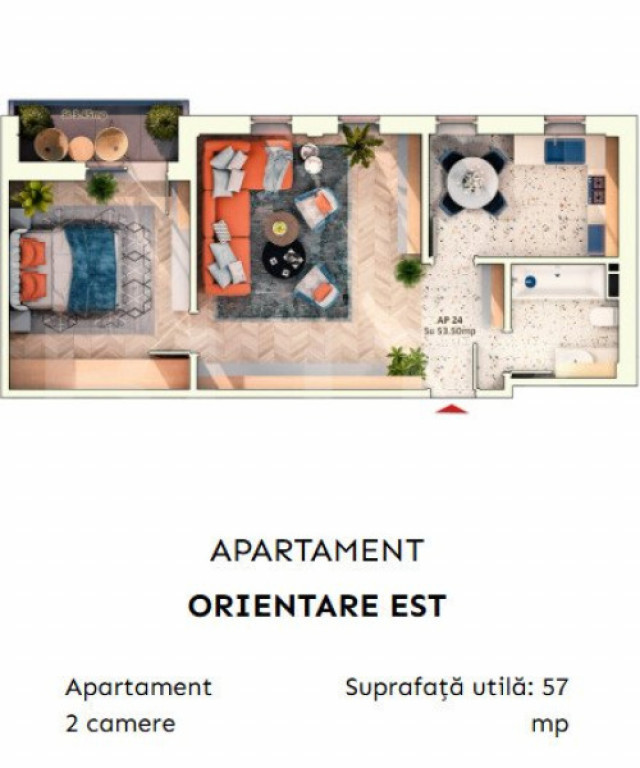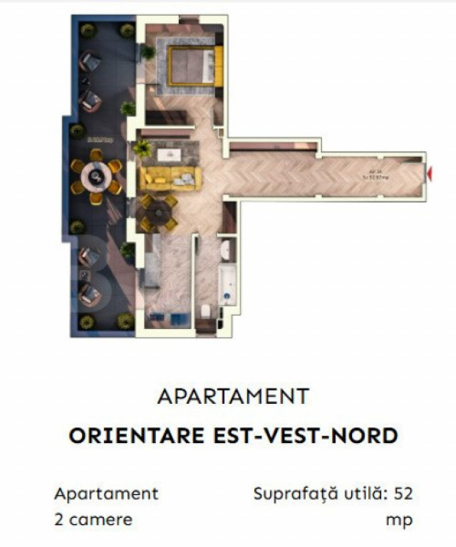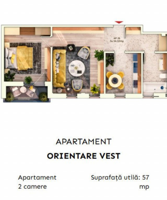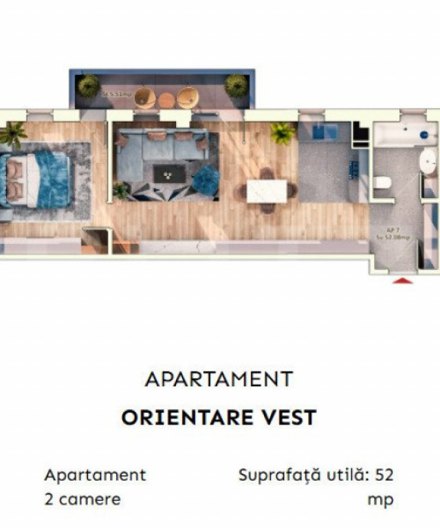 Apartament 2 camere semidecomandate, 52 mp, 9.30mp balcon, p