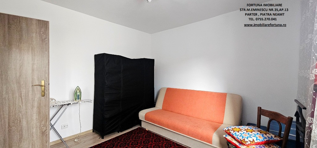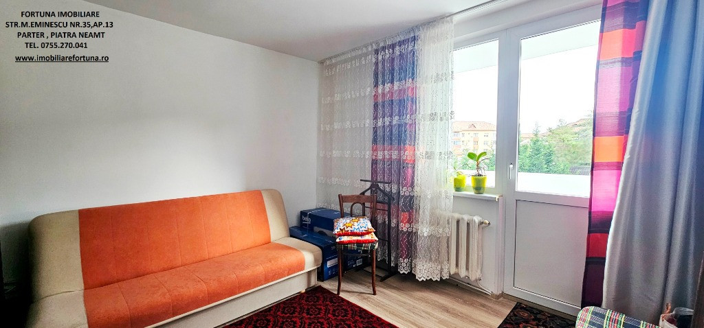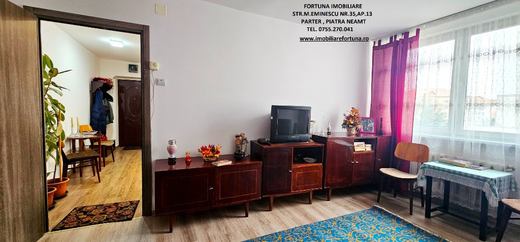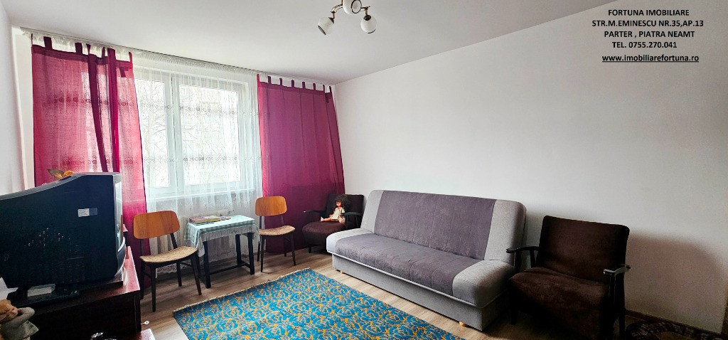 APARTAMENT CU 2 CAMERE DECOMANDATE, ET. 1, MOBILAT ȘI UTILAT, CU BOXĂ, SITUAT ÎN CARTIERUL PRECISTA, ZONA BISERICA NOUA, 69.000 EURO Dacă vă doriți o investiție sigură și inteligentă pentru viitorul dumneavoastră, FORTUNA IMOBILIARE vă propune acest imobil cochet și îngrijit, ce răspunde tuturor categoriilor de vârstă, situat la etajul 1, într-un bloc cu 4 etaje, construit în anul 1980. Apartamentul are o suprafață utilă de 50,34 mp + 3,74 mp suprafață balcon, 54,08 mp suprafață totală, fiind compus din hol foarte spațios, locuibil, baie cu aerisire naturală, cameră de zi, dormitor, bucătărie și balcon. Se remarcă printr-o compartimentare inteligentă, oferind încăperi generoase. Beneficiază de ușă antiefracție, acces controlat prin interfon, centrală termică, tâmplărie termopan, uși interioare schimbate, parchet, gresie, faianță, termosistem exterior integral, orientare SUD - EST și poziționare pe mijloc, fiind foarte călduros și luminos. Are instalațiile sanitară, termică și electrică schimbate. Deține o boxa mare situata la subsolul blocului. Se vinde mobilat și utilat, așa cum este prezentat în fotografii. Oferă acces către numeroase hub-uri comerciale, centre medicale și alte locuri de interes pentru chiriași/rezidenți. Preț 69.000 euro Întrucât descrierea acestui imobil nu poate fi cuprinsă în câteva rânduri, pentru o prezentare detaliată, oferirea unor informații suplimentare referitoare la situația juridică / identificarea imobilului și programarea unei vizionări, vă invităm la sediul nostru, Fortuna Imobiliare, situat pe str. M. Eminescu, nr. 35, ap. 13, parter, lângă fostul Tribunal, tel. contact 0755.270.041. Your comfort is our priority ! Oferta noastră completă o găsiți aici: https://imobiliarefortuna.ro/
