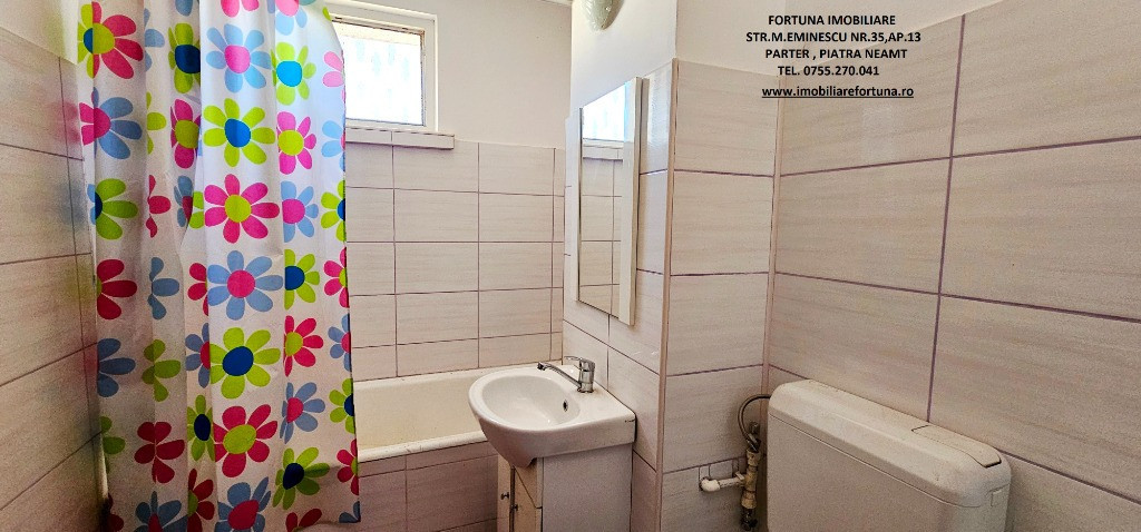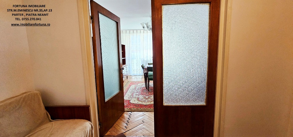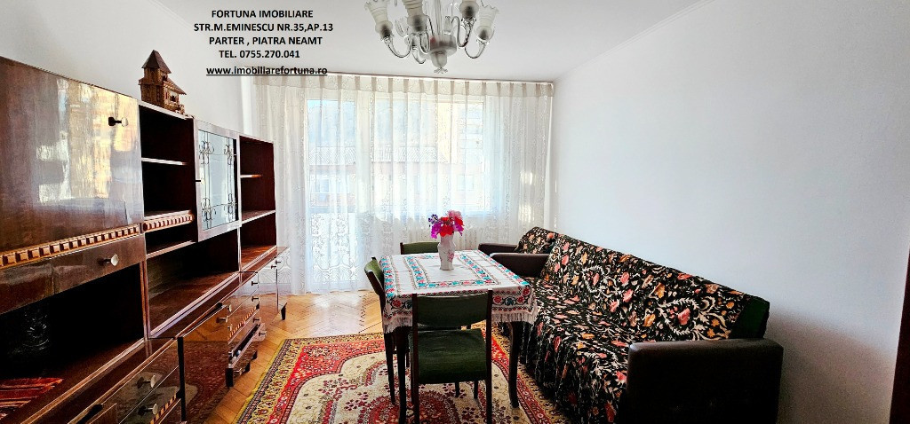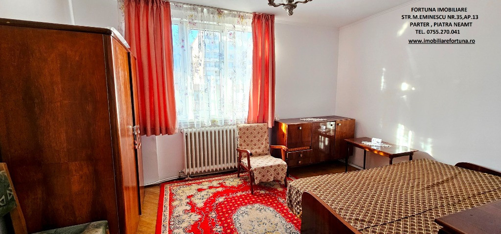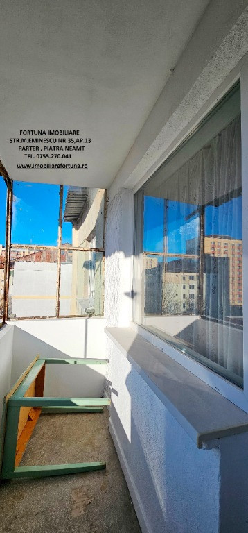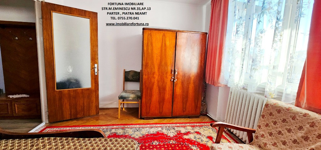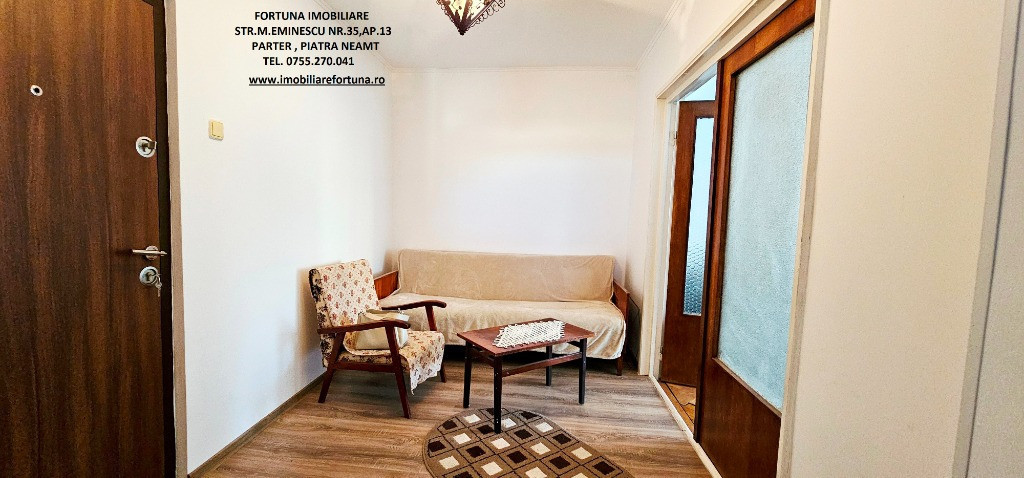 APARTAMENT 2 CAMERE, ZONA MACRINA DĂRMĂNEȘTI, 49.900 EURO Dacă sunteți în căutarea unui imobil pentru locuit sau pentru o investiție imobiliară, situat in proximitatea Complexului Orion-Profi, FORTUNA IMOBILIARE vă supune atenției acest apartament cu 2 camere, călduros și luminos, ce oferă o priveliște panoramică a orașului Piatra Neamț. Imobilul, pe structură decomandată, situat la etajul 4 acoperit cu pod, este compus din 2 holuri, bucătărie, baie (cu aerisire naturală), camera de zi, dormitor și balcon. Este prevăzut cu boxă din construcție, în proprietate. Are suprafața utilă totală de 63,48 mp ( incluzând suprafața balconului și a boxei ). Beneficiază de îmbunătățiri : centrală termică noua Ariston, termopane, ușă antiefracție la intrare, acces controlat prin interfon, gresie, faianță, termosistem interior integral. Are toate actele la zi, iar dispoziția posesiei imobilului se face la semnarea actelor de vânzare. Preț 49.900 euro Pentru o prezentare detaliată a acestei oferte, furnizarea unor informații suplimentare referitoare la situația juridică / identificarea imobilului și programarea unei vizionări, vă invităm la sediul nostru, Fortuna Imobiliare, situat in Piatra Neamt, str. M. Eminescu, nr. 35, ap. 13, parter, jud. Neamt, lângă fostul Tribunal, tel. contact 0755.270.041. Your comfort is our priority ! Oferta noastră completă o găsiți aici: https://imobiliarefortuna.ro/