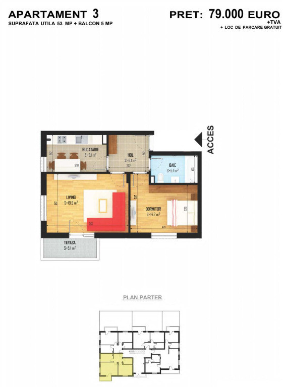 Apartament decomandat cu 2 camere ,cu o suprafata 53 mp + balcon de 5mp . Locul de parcare ested inclus in pret.Imobilul dispune si de o terasa de 5 mp . Apartamentul este situate intr- o zona foarte buna cu diverse facilitate la cateva minute de mers pe jos, spre exemplu, in imprejurimi regasim : saloane de infrumusetare, Profi , Mega Image ,Lidl, veterinar, farmacie, florarie si restaurante . COMISION 0% PRET:79,000 EURO FARA TVA Pentru mai multe detalii ma puteti contacta oricand, chiar si in WEEKEND la numarul de telefon 0770670090 Elena