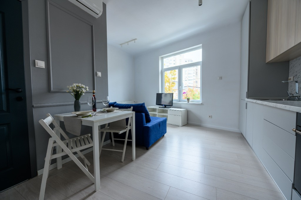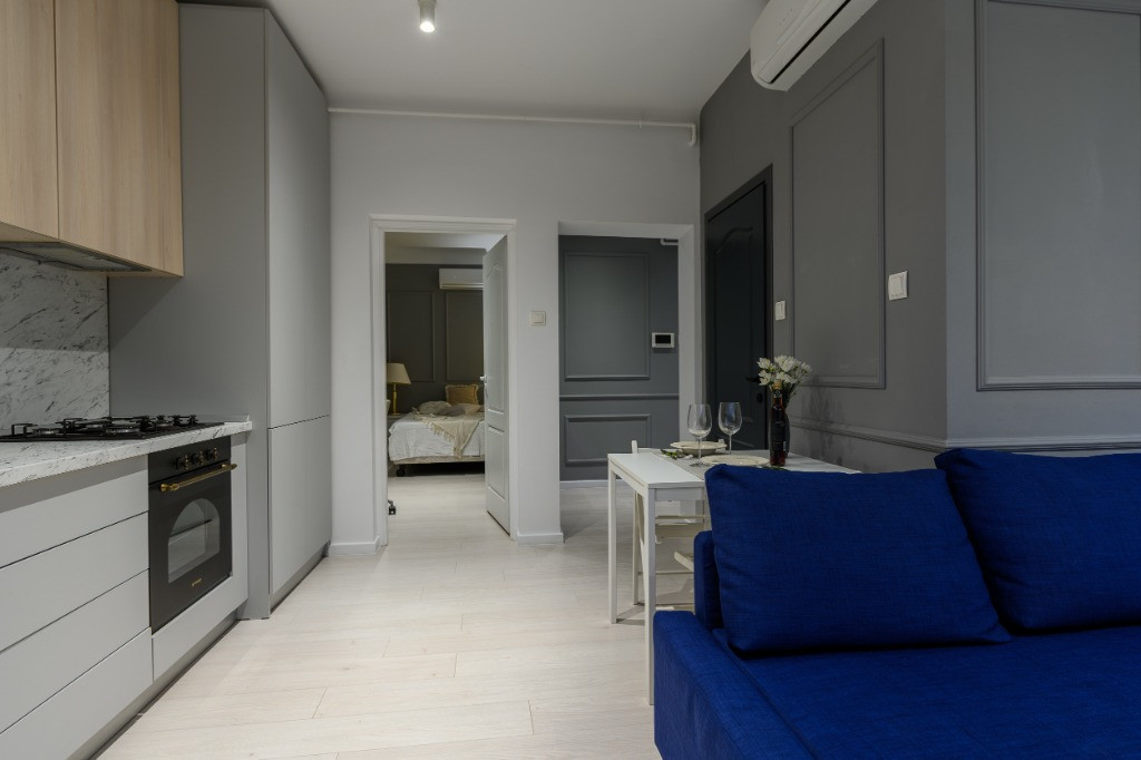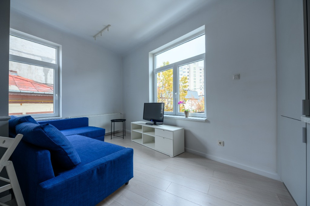 Apartament de 2 camere in suprafata de 38mp, cu design modern, placut si confortabil. Complet mobilat si utilat cu obiecte sanitare si electrocasnice de inalta calitate. Dotari: - mobilier modern si functional, pat dublu si canapea extensibila, birou de lucru - obiecte sanitare de calitate - masa extensibila, frigider, cuptor electric, plita, hota, aparat A/C, chiuveta, masina de spalat rufe, centrala termica proprie pe gaz, senzor ambiental, senzor gaze, videointerfon - ferestre mari si multa lumina naturala - instalatii sanitare noi - conducte si tevi noi - instalatie electrica noua. Vila in care se afla apartamentul beneficiaza de o curte interioara spatioasa in care se gaseste o terasa acoperita si mobilata cu mese si canapele, un semineu exterior, banci pentru relaxare si spatiu verde. Curtea interioara si terasa sunt comune pentru toate cele 6 apartamente. VECINATATI: Piata Obor si Veranda Mall, Metrou Bucur Obor (5 minute), Transport public (4 minute).