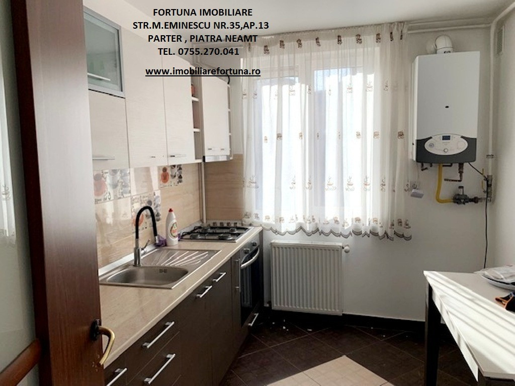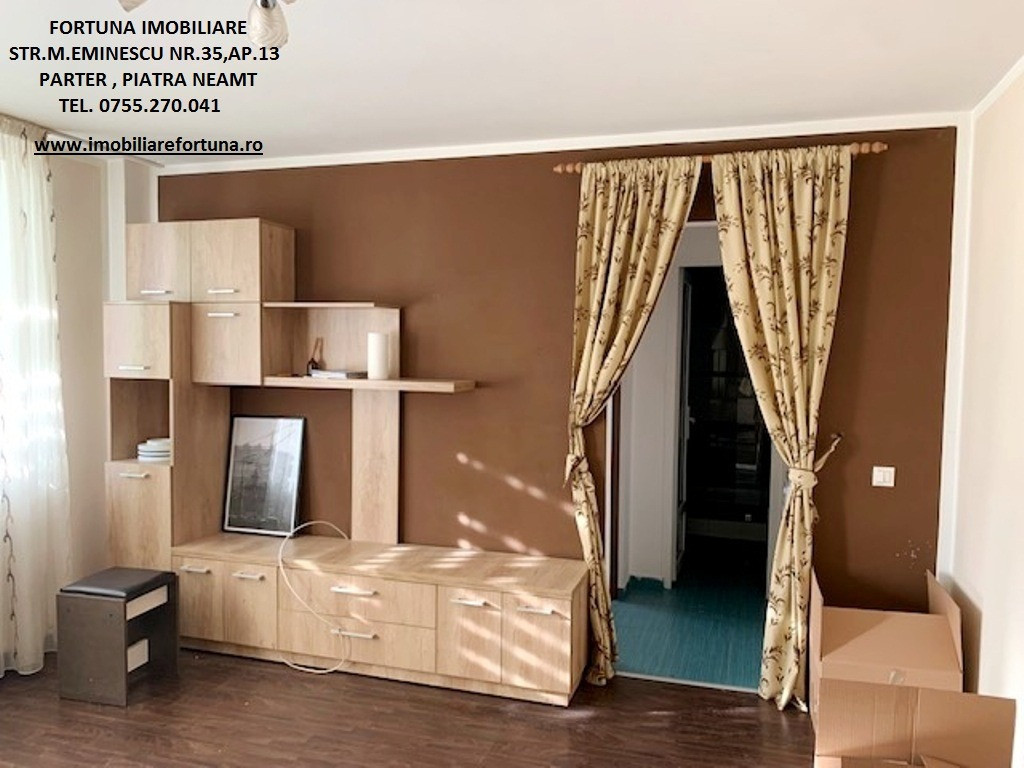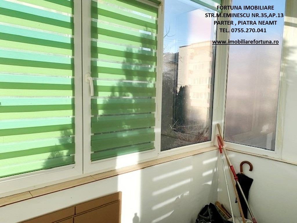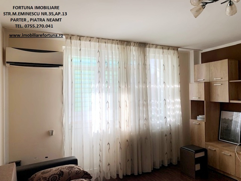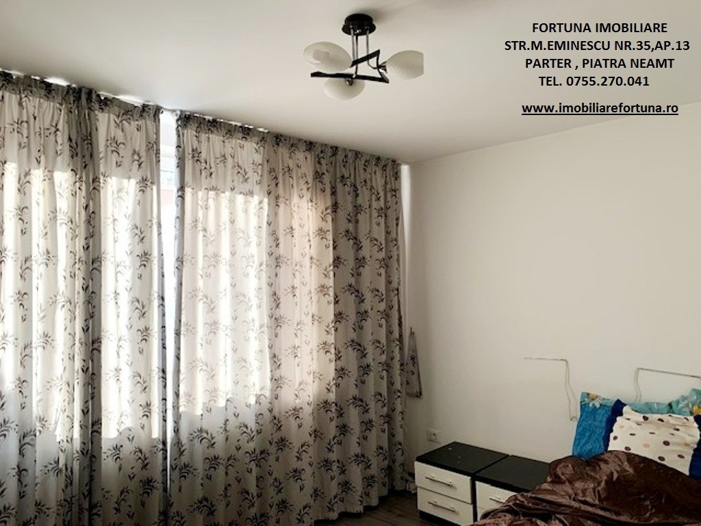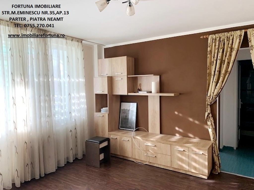 APARTAMENT 2 CAMERE, ETAJUL 1, ZONĂ ULTRACENTRALĂ, 55.000 EURO Dacă sunteți în căutarea unui imobil pentru locuit sau pentru o investiție imobiliară, FORTUNA IMOBILIARE vă supune atenției acest apartament cu 2 camere, cu o structură semidecomandată, amplasat în zona ultracentrală din Piatra Neamț, la etajul 1, în bloc cu 4 etaje. Apartamentul are orientare cardinală SUD, termosistem exterior integral și poziționare pe mijloc, fiind luminos și călduros. Are suprafața utilă de 43,55 mp + suprafața balcon de 5,17 m, suprafața totală 48,72 mp, este prevăzut cu ușă antiefracție, acces controlat prin interfon, centrala termica, termopan, gresie, faianță, parchet. Este compus din 2 holuri, bucătărie, 2 camere, baie și balcon ( închis cu termopan ). Se află la confluența principalelor obiective de interes din Municipiul Piatra Neamț (turistice, comerciale, culturale, educaționale, recreative, medicale etc). Preț 55.000 euro . Pentru o prezentare detaliată a acestei oferte, furnizarea unor informații suplimentare referitoare la situația juridică / identificarea imobilului și programarea unei vizionări, vă invităm la sediul nostru, Fortuna Imobiliare, situat in Piatra Neamț, str. M. Eminescu, nr. 35, ap. 13, parter, jud. Neamț, lângă fostul Tribunal, tel. contact 0755.270.041. Your comfort is our priority ! Oferta noastră completă o găsiți aici: https://imobiliarefortuna.ro/