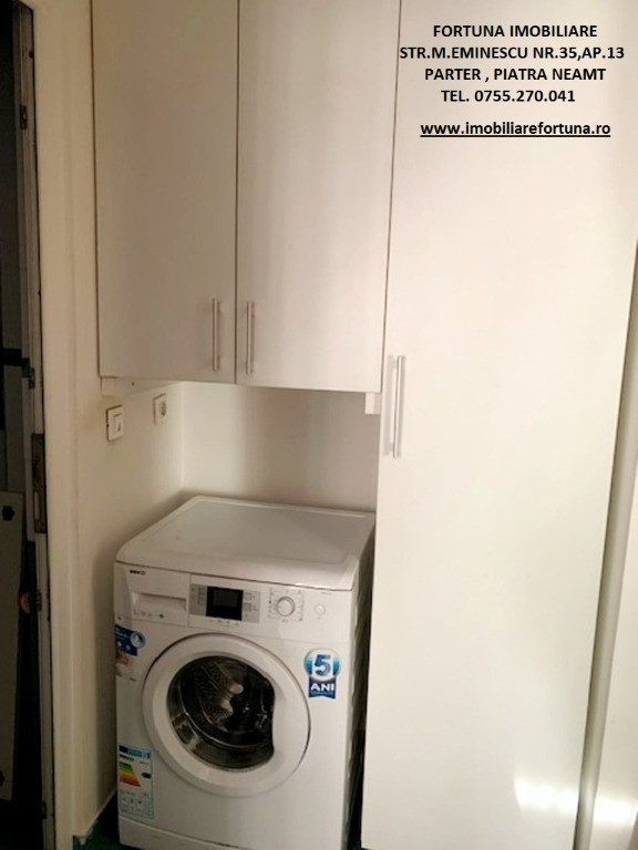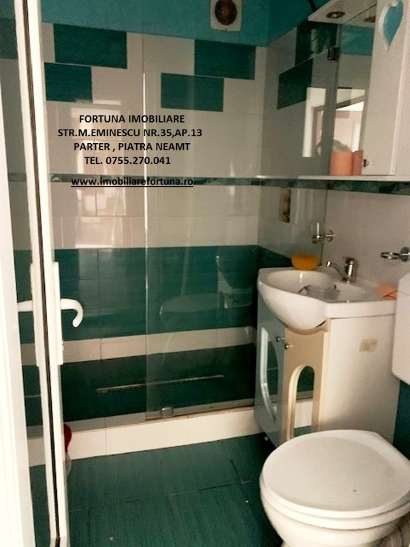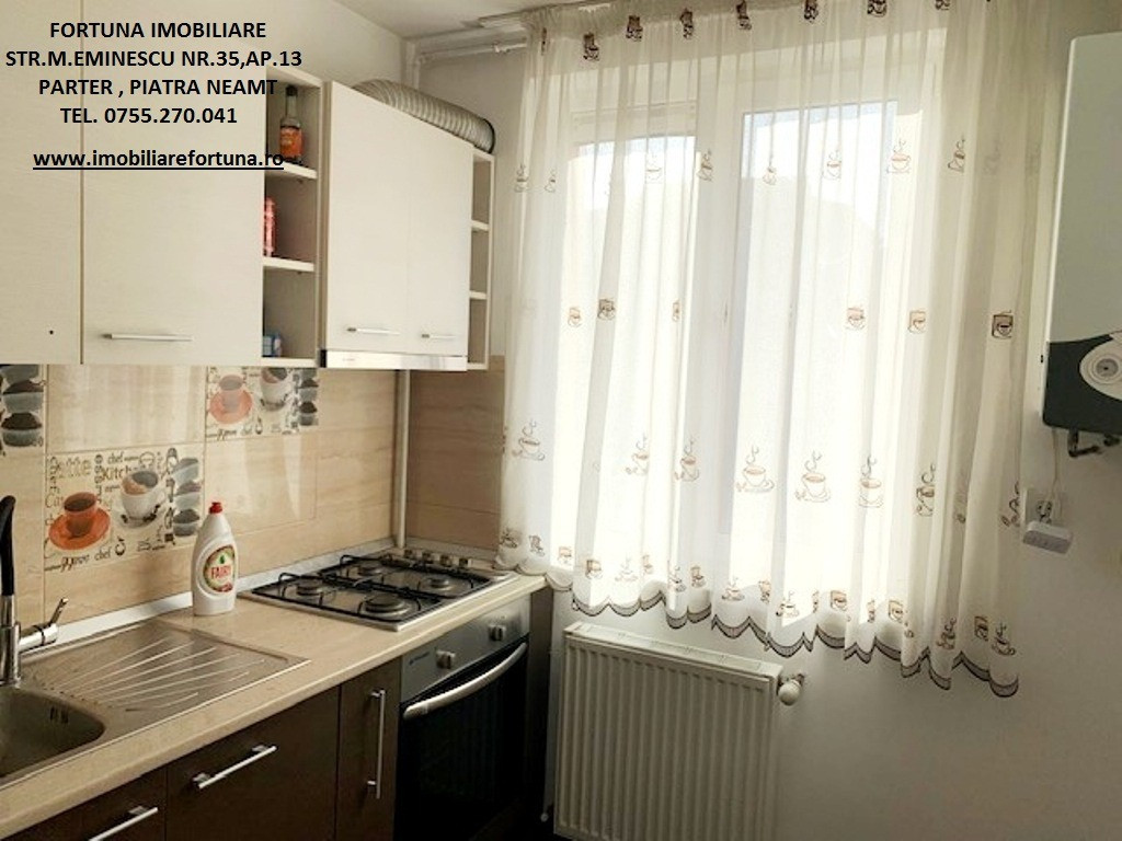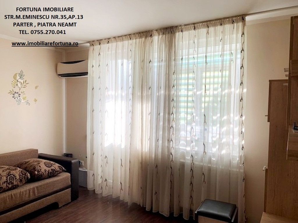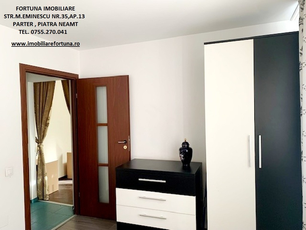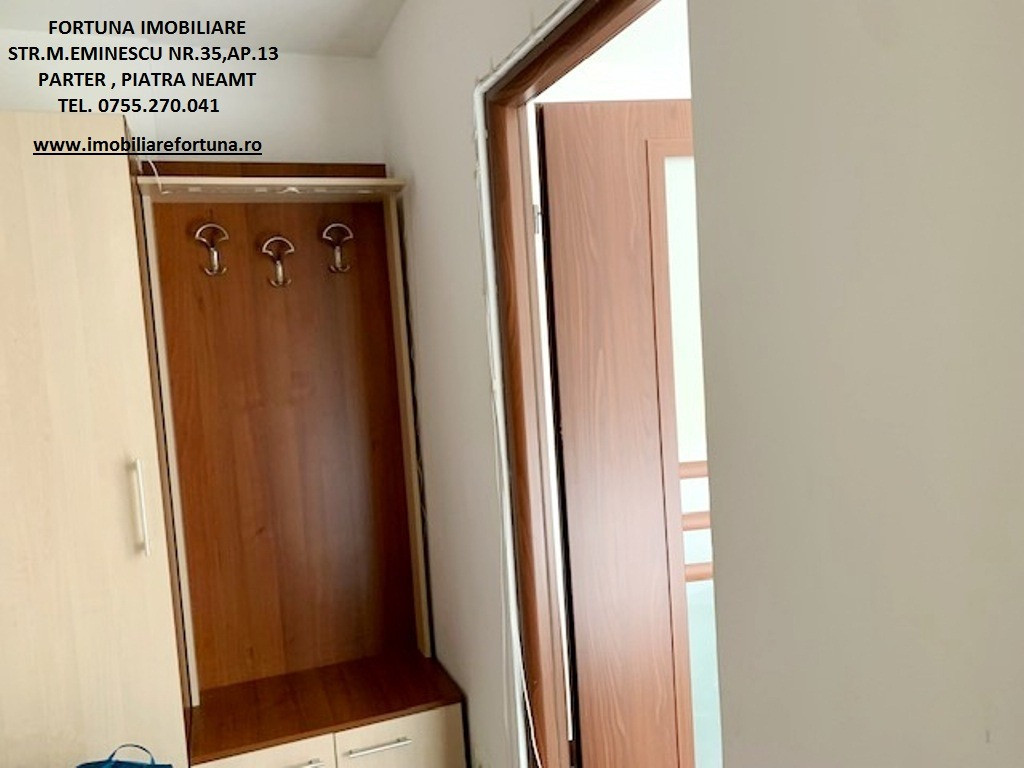 APARTAMENT 2 CAMERE, ETAJUL 1, ZONĂ ULTRACENTRALĂ, 55.000 EURO Dacă sunteți în căutarea unui imobil pentru locuit sau pentru o investiție imobiliară, FORTUNA IMOBILIARE vă supune atenției acest apartament cu 2 camere, cu o structură semidecomandată, amplasat în zona ultracentrală din Piatra Neamț, la etajul 1, în bloc cu 4 etaje. Apartamentul are orientare cardinală SUD, termosistem exterior integral și poziționare pe mijloc, fiind luminos și călduros. Are suprafața utilă de 43,55 mp + suprafața balcon de 5,17 m, suprafața totală 48,72 mp, este prevăzut cu ușă antiefracție, acces controlat prin interfon, centrala termica, termopan, gresie, faianță, parchet. Este compus din 2 holuri, bucătărie, 2 camere, baie și balcon ( închis cu termopan ). Se află la confluența principalelor obiective de interes din Municipiul Piatra Neamț (turistice, comerciale, culturale, educaționale, recreative, medicale etc). Preț 55.000 euro . Pentru o prezentare detaliată a acestei oferte, furnizarea unor informații suplimentare referitoare la situația juridică / identificarea imobilului și programarea unei vizionări, vă invităm la sediul nostru, Fortuna Imobiliare, situat in Piatra Neamț, str. M. Eminescu, nr. 35, ap. 13, parter, jud. Neamț, lângă fostul Tribunal, tel. contact 0755.270.041. Your comfort is our priority ! Oferta noastră completă o găsiți aici: https://imobiliarefortuna.ro/