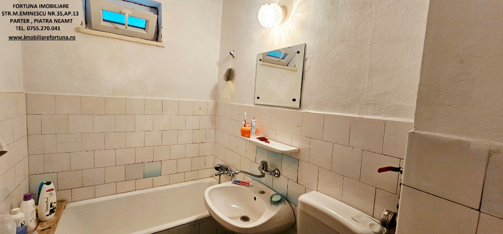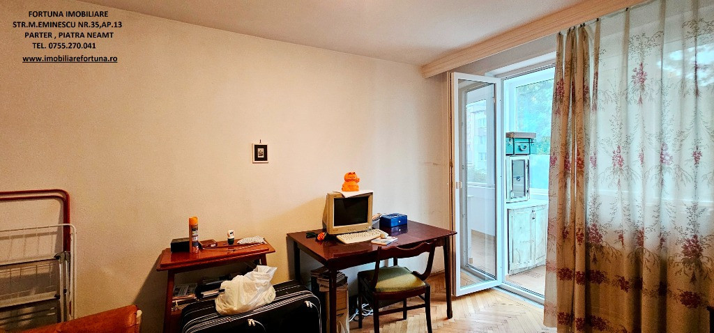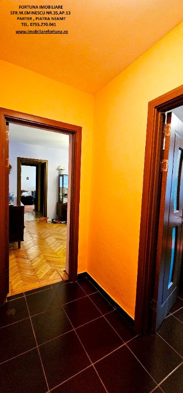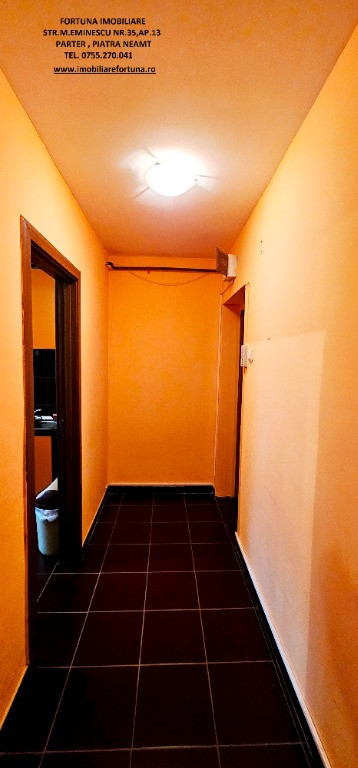 APARTAMENT 2 CAMERE, ETAJUL 2, ZONA ORION, 54.000 EURO Dacă sunteți în căutarea unui imobil pentru locuit sau pentru o investiție imobiliară, FORTUNA IMOBILIARE vă supune atenției acest apartament cu 2 camere, cu o structură semidecomandată, ce răspunde tuturor categoriilor de vârstă, amplasat la etajul 2, într-un bloc cu 4 etaje din zona Orion. Apartamentul are orientare cardinală EST, termosistem exterior integral, fiind luminos și călduros. Imobilul cu suprafața utilă de 47,61 mp + balcon de 4,97 mp, suprafața totală de 52,58 mp, suprafața construită de 57,96 mp, este prevăzut cu ușă antiefracție, acces controlat prin interfon, centrala termică, termopan, uși interioare schimbate, gresie, faianță etc. Este compus din hol, bucătărie spațioasă, baie cu aerisire naturală, cameră de zi, dormitor și balcon generos, închis cu termopan. Se vinde așa cum este prezentat în fotografii, bucătăria mobilată și utilată cu aragaz, combina frigorifica, mașină de spălat rufe. Se află la confluența principalelor obiective de interes din Municipiul Piatra Neamț (turistice, comerciale, culturale, educaționale, recreative, medicale etc). Preț 54.000 euro. Pentru o prezentare detaliată a acestei oferte, furnizarea unor informații suplimentare referitoare la situația juridică / identificarea imobilului și programarea unei vizionări, vă invităm la sediul nostru, Fortuna Imobiliare, situat in Piatra Neamț, str. M. Eminescu, nr. 35, ap. 13, parter, jud. Neamț, lângă fostul Tribunal, tel. contact 0755.270.041. Your comfort is our priority ! Oferta noastră completă o găsiți aici: https://imobiliarefortuna.ro/
