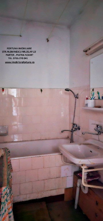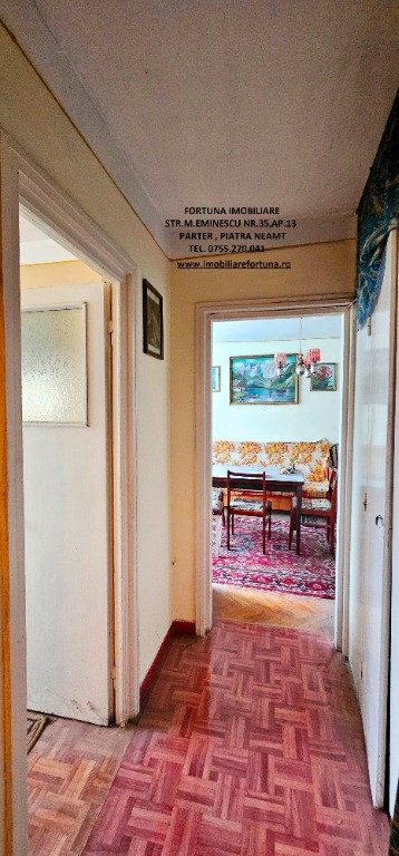 APARTAMENT 2 CAMERE, ETAJUL 8, CU UN VIEW SPECTACULOS, ZONĂ ULTRACENTRALĂ, 43.000 EURO FORTUNA IMOBILIARE oferă spre achiziționare acest apartament situat in zona ultracentrala, cu o vedere panoramică, ce asigură o priveliște unică a orașului Piatra Neamț - peisaj montan, verde și aer curat. Apartamentul este pe structură semidecomandată, fiind compus din 2 camere, 2 holuri, bucătărie, baie și 2 balcoane. Are orientare cardinală VEST și termosistem exterior integral, fiind luminos și călduros. Are suprafața utilă totală de 54,30 mp, este prevăzut cu acces controlat prin interfon si tâmplărie termopan. Necesită renovare. Se află la confluența principalelor obiective de interes din Municipiul Piatra Neamț (turistice, comerciale, culturale, educaționale, recreative, medicale etc). Preț 43.000 euro . Pentru o prezentare detaliată a acestei oferte, furnizarea unor informații suplimentare referitoare la situația juridică / identificarea imobilului și programarea unei vizionări, vă invităm la sediul nostru, Fortuna Imobiliare, situat pe str. M. Eminescu, nr. 35, ap. 13, parter, lângă fostul Tribunal, tel. contact 0755.270.041. Your comfort is our priority ! Oferta noastră completă o găsiți aici: https://imobiliarefortuna.ro/