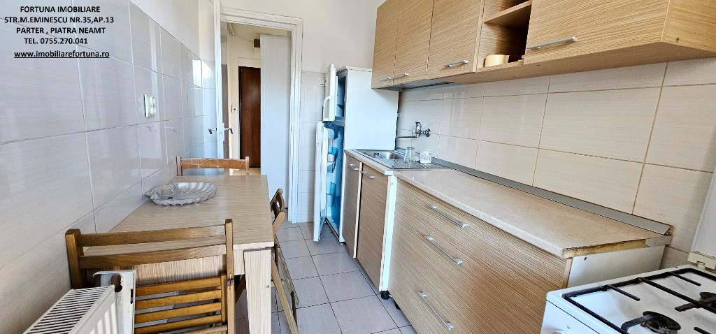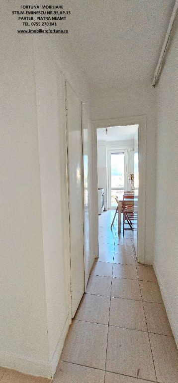 APARTAMENT 2 CAMERE, ETAJUL 3/4, ZONĂ ULTRACENTRALĂ, 55.000 EURO FORTUNA IMOBILIARE oferă spre achiziționare acest apartament cu o structură semidecomandată, destinat tuturor categoriilor de vârstă, compus din 2 camere, 2 holuri, bucătărie, baie și balcon, amplasat în zona ultracentrală a municipiului Piatra Neamț, la etajul 3. Are suprafața utilă totală de 47 mp, este prevăzut cu acces controlat prin interfon, centrală termică, tâmplărie termopan, gresie și faianță în baie și bucătărie, gresie în hol. Instalația termică este realizata pe cupru, iar instalația electrică este prevăzută cu trasee și siguranțe separate pentru fiecare consumator electric casnic. Apartamentul este foarte luminos și călduros, având orientare cardinală SUD - EST. Necesită renovare. Se află la confluența principalelor obiective de interes din Municipiul Piatra Neamț (turistice, comerciale, culturale, educaționale, recreative, medicale etc). Preț 55.000 euro. Pentru o prezentare detaliată a acestei oferte, furnizarea unor informații suplimentare referitoare la situația juridică / identificarea imobilului și programarea unei vizionări, vă invităm la sediul nostru, Fortuna Imobiliare, situat pe str. M. Eminescu, nr. 35, ap. 13, parter, lângă fostul Tribunal, tel. contact 0755.270.041. Your comfort is our priority ! Oferta noastră completă o găsiți aici: https://imobiliarefortuna.ro/
