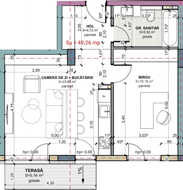 Blitz va prezinta un apartament cu 2 camere si o terasa de 20 mp în Terra Gardens, Cluj-Napoca Locuințe moderne într-un ansamblu exclusivist cu acces privat, compus din case și blocuri cu regim redus de înălțime – o alegere ideală pentru familii sau investiție sigură. Termen de finalizare: august 2026 Comision 0% Exemplu disponibil – etajul 1 • parcare subterana 10.000 tva inclus • Suprafață utilă: 49,26 mp • 1 dormitor, o baie • Living generos cu bucătărie open-space • Predare la stadiul de semifinisat – 2 mâini de glet, șapă, instalații trase pe poziții • Încălzire în pardoseală • Centrală termică smart pe bloc Pretul afisat nu include TVA-ul! Cod ofertă / ID BLITZ: P158099 Id intern: P158099
