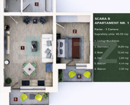 Blitz propune la vânzare apartament cu 2 camere, bucătărie open space cu living, situat la parterul unui imobil modern. Locuința are o suprafață utilă de 45,60 mp și este compartimentată eficient pentru a oferi confort și funcționalitate. Apartamentul este compus din living spațios cu bucătărie open space, dormitor luminos, baie și balcon de 7,52 mp. Compartimentarea este practică, iar suprafețele sunt bine optimizate pentru a crea un ambient aerisit și plăcut. Proprietatea este ideală atât pentru locuit, cât și pentru investiție, fiind potrivită pentru un cuplu sau pentru închiriere. Zona oferă acces facil către puncte de interes precum magazine, mijloace de transport, școli și alte facilități urbane. Pentru mai multe detalii sau pentru programarea unei vizionări, vă stăm la dispoziție.