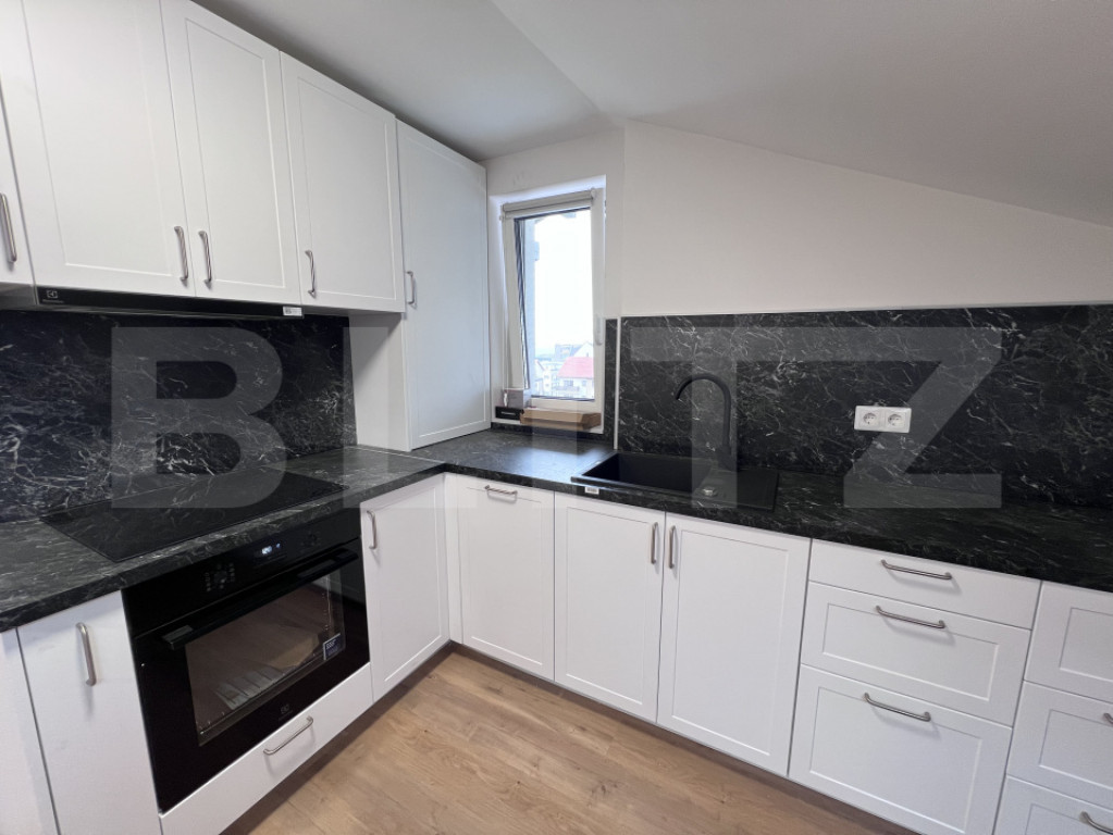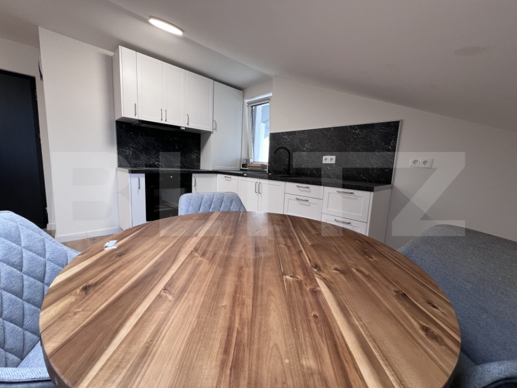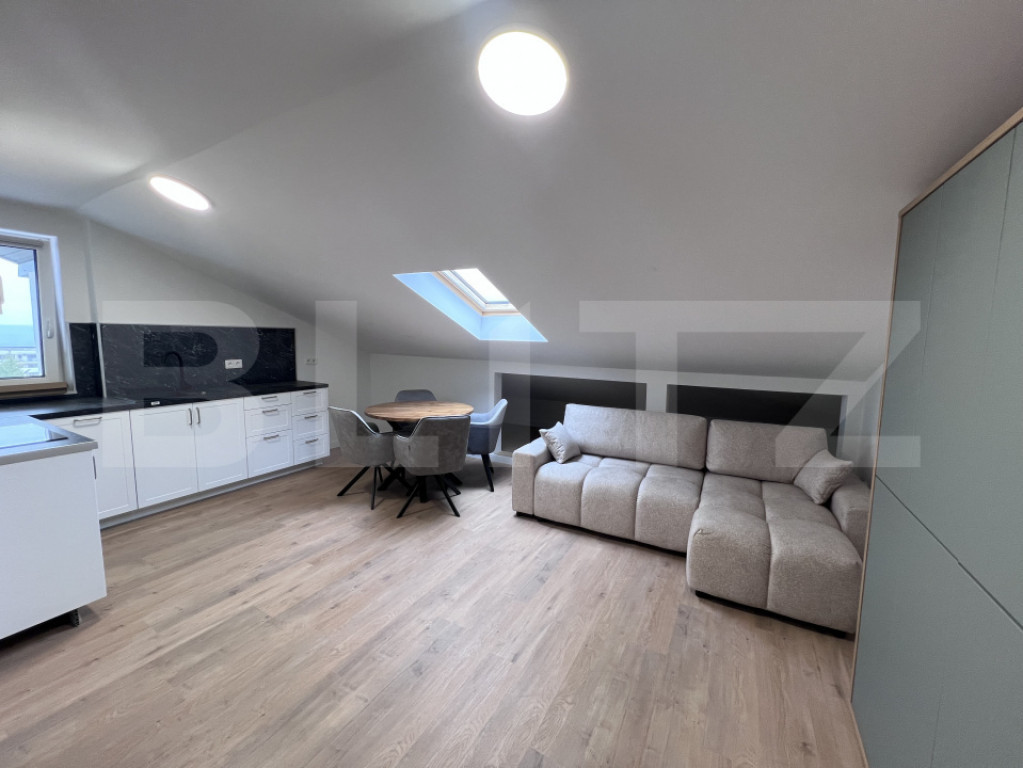 Blitz oferă spre închiriere apartament cu 2 camere, 550 euro, parcare inclusă, situat la mansardă, într-un imobil tip vilă, zona Europa – zona Mercedes-Benz, Cluj-Napoca Apartamentul este situat la mansarda unei vile, într-o zonă foarte liniștită din cartierul Europa, aproape de zona Mercedes-Benz. Locuința beneficiază de ultrafinisaje și de o compartimentare modernă, fiind compusă din dormitor, living open space cu bucătărie și baie. Apartamentul este mobilat lux, cu mobilier modern și de calitate, astfel încât viitorii chiriași să se bucure de un spațiu elegant și confortabil. Bucătăria este dotată cu plită electrică cu cuptor, iar locuința dispune de încălzire în pardoseală prin centrală termică proprie, aer condiționat, precum și electrocasnice precum mașină de spălat vase și mașină de spălat rufe. De asemenea, apartamentul va beneficia și de dressing. În prețul chiriei de 550 euro/lună este inclus și un loc de parcare. Pentru mai multe detalii sau informații suplimentare, vă invităm să ne contactați telefonic. Cod ofertă / ID BLITZ: P166872 Id intern: P166872