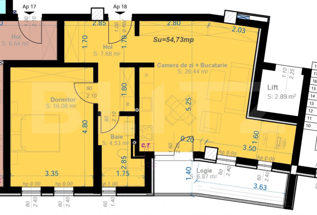 Blitz vă propune o locuință cu un design contemporan și o compartimentare inteligentă, situată în zona Calea Aradului. Acest model de apartament este proiectat pentru a maximiza lumina naturală și spațiul util, fiind disponibil la etaje diferite ale imobilului (P+5). Specificații și Suprafețe (Suprafață Utilă: 54.73 mp) Zona de zi + Bucătărie: 26.44 mp – un spațiu deschis, generos, ideal pentru socializare și relaxare. Dormitor: 16.08 mp – suprafață mare ce permite configurarea unui dressing generos sau a unui spațiu de lucru. Baie: 4.53 mp. Hol de acces: 7.68 mp – oferă o primire spațioasă și loc pentru depozitare haine/încălțăminte. Logie: 6.87 mp – o terasă cu formă dinamică, perfectă pentru momentele de relaxare. Opțiuni Parcare (se achiziționează separat) Loc de parcare Suprateran: 7.000 Euro + TVA Loc de parcare Subteran: 10.000 Euro + TVA Puncte forte ale acestui model Arhitectură modernă: Livingul generos și logia spațioasă oferă un sentiment de libertate și stil. Flexibilitate etaj: Puteți alege unitatea la etajul dorit (în funcție de disponibilitatea curentă). Finalizare 2026: Mutare programată în Decembrie 2026, cu finisaje de înaltă calitate. Locație strategică: Proximitate excelentă față de centrele comerciale din zona Aradului (Iulius Town, Hornbach, Decathlon). Preț Apartament: 110.600 Euro + TVA. Va asteptam cu drag la o vizionare! Cod ofertă / ID BLITZ: P164205 Id intern: P164205