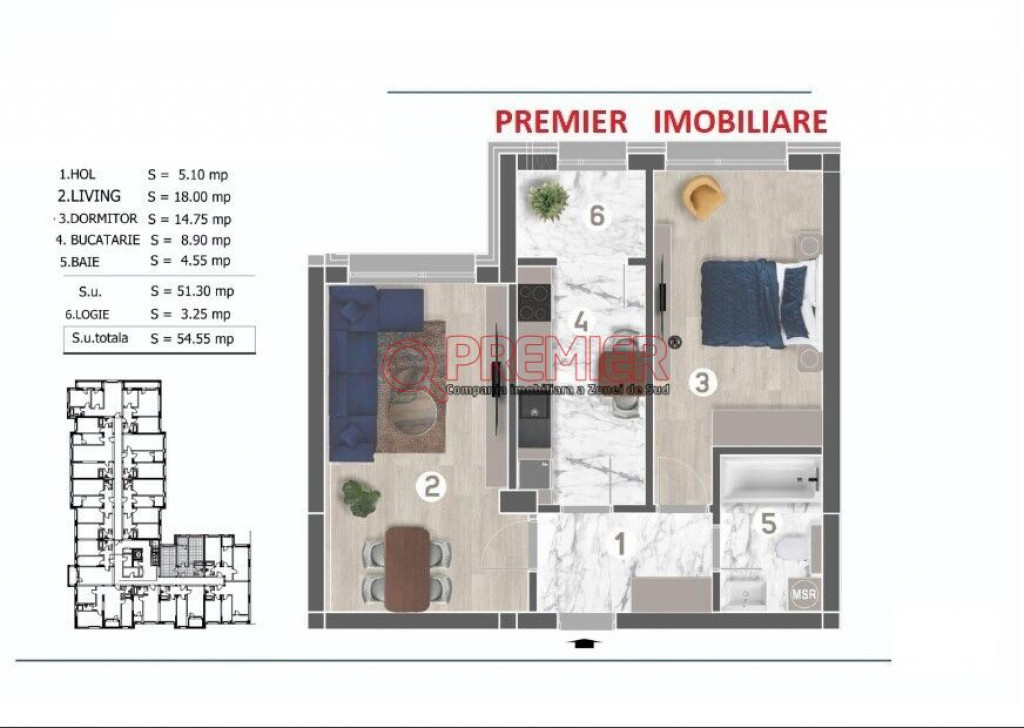Premier Imobiliare va ofera spre vanzare un apartament de 2 camere decomandat, situat la etajul 1 din 6 nivele, cu o suprafata totala utila de 54,55 mp la pretul promotional de :