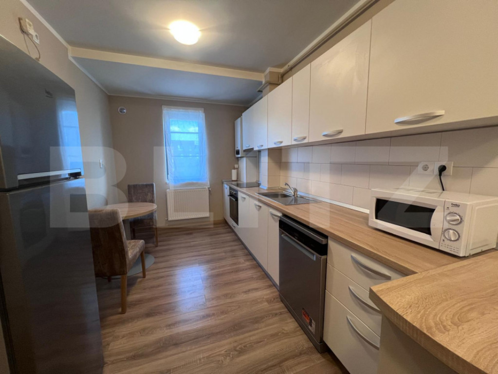 Blitz oferă spre închiriere apartament cu 2 camere, situat în complexul Park Lake, în zona Iulius Mall Cluj, din Gheorgheni, Cluj-Napoca. Apartamentul este full decomandat și se află la etajul 9 din 10, într-un imobil dotat cu lift, oferind o priveliște frumoasă și multă lumină naturală. Compartimentarea este practică și modernă, fiind compus din living, dormitor, bucătărie separată, baie, hol și balcon. Livingul este spațios și amenajat cu canapea extensibilă, Smart TV și aer condiționat, iar de aici se face accesul către balcon, oferind un spațiu plăcut pentru relaxare. Pe hol se află un dressing foarte mare pentru depozitare, ceea ce aduce un plus de organizare. Bucătăria este complet utilată și mobilată, fiind dotată cu cuptor, plită electrică, cuptor cu microunde, mașină de spălat rufe, mașină de spălat vase și frigider mare, pregătită pentru utilizare imediată. Dormitorul este confortabil și dispune de pat matrimonial, dulap mare tip dressing și Smart TV, oferind un spațiu ideal pentru odihnă. Baia este dotată cu cadă cu duș, iar apartamentul beneficiază de centrală proprie nouă cu încălzire prin calorifere, asigurând costuri eficiente și confort termic. Locul de parcare proprie este disponibil la prețul de 50 euro/lună, un avantaj important pentru zona Iulius Mall. Apartamentul este ideal pentru un cuplu sau o persoană care își dorește o locuință modernă, bine compartimentată și poziționată într-o zonă premium, aproape de centre comerciale, transport în comun și facilități urbane. Pentru mai multe detalii sau programarea unei vizionări, vă invităm să ne contactați. Cod ofertă / ID BLITZ: P168876 Id intern: P168876