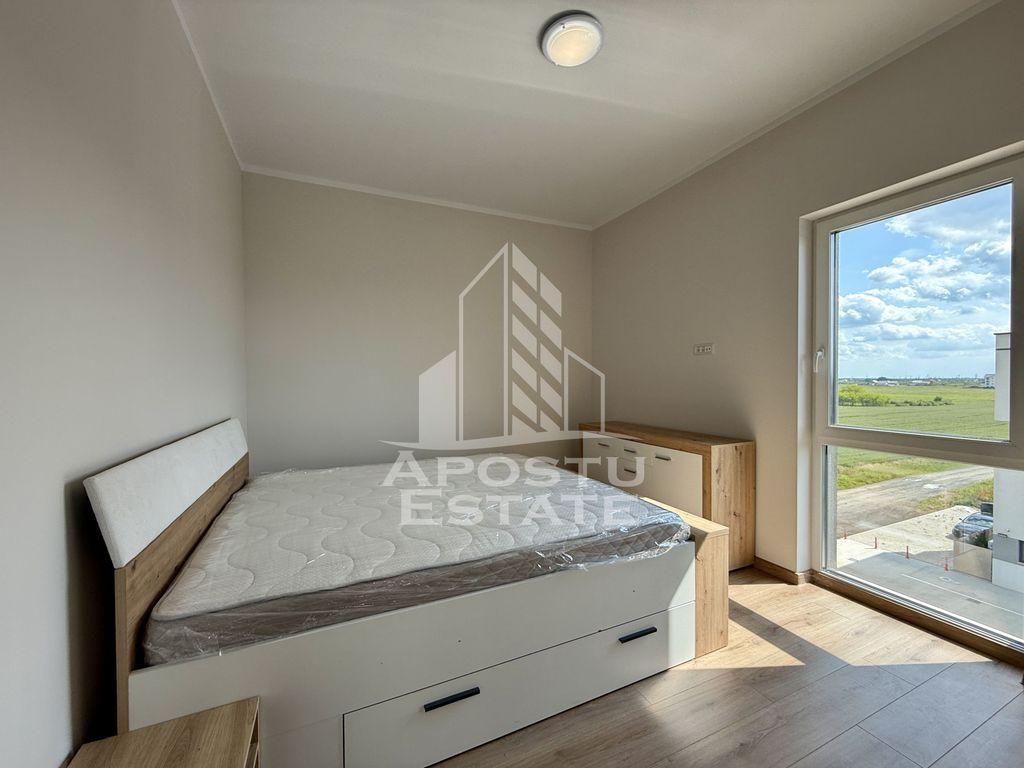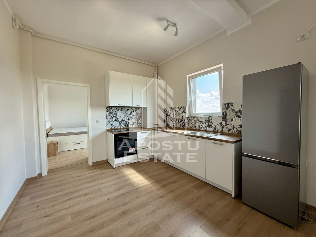 APOSTU ESTATE va propune spre inchiriere un apartament cu 2 camere, open-space situat in zona Torontalului. Apartamentul este amplasat la etajul 3 intr-un imobil cu lift. Beneficiaza de 2 locuri de parcare in curtea blocului, cu acces cu telecomanda. Confortul termic se realizeaza prin intermediul centralei proprii pe gaz, cu sistem de incalzire prin pardoseala si a aparatului de aer conditionat. Proprietatea este mobilata si utilata complet cu: Plita pe inductie, cuptor electric, masina de spalat vase, masina de rufe, frigider, televizor. Compartimentare: - living cu bucatarie open-space - dormitor spatios si luminos - baie cu cada - terasa cu acces din living NU se accepta animale de companie. Va asteptam cu drag la o vizionare!