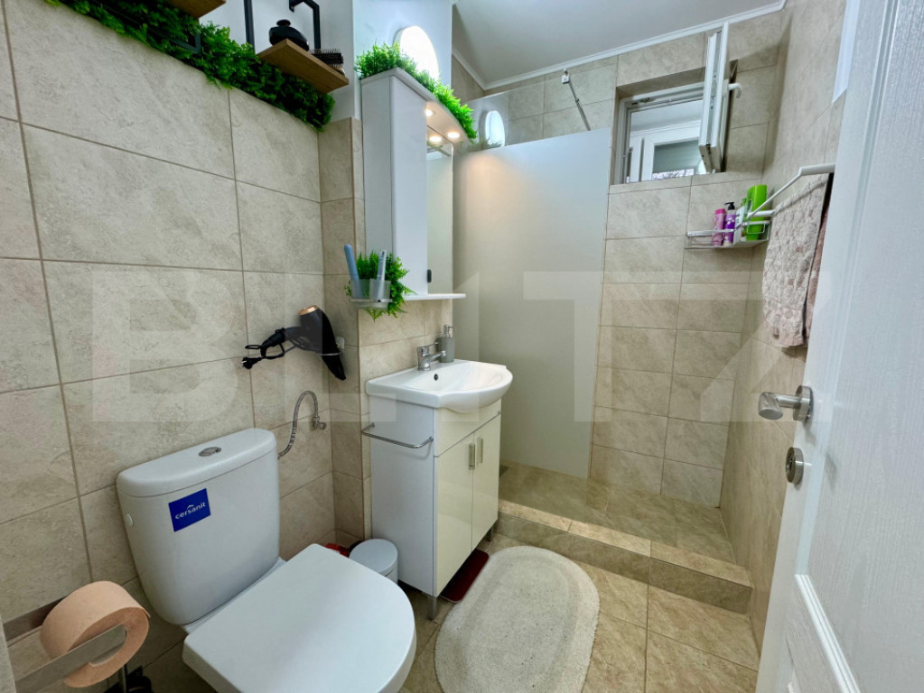 Blitz vă propune spre vânzare un apartament cu 2 camere, semidecomandat, situat în cartierul Rogerius, într-o zonă cu acces rapid către școli, grădinițe, Piața Rogerius, magazine, restaurante, stații de transport în comun și Spitalul Pelican. Apartamentul este poziționat la etajul 2 din 4 și are o suprafață utilă de 49,70 mp, iar suprafața utilă totală este de 54,83 mp, incluzând balconul închis. Proprietatea a fost renovată complet în urmă cu 2 ani: instalații electrice și sanitare schimbate, țevi de căldură înlocuite, calorifere noi, geamuri termopan (inclusiv la baie), parchet, gresie și faianță moderne, rulouri exterioare și aer condiționat. Baia beneficiază de geam pentru aerisire naturală. Se vinde complet mobilat și utilat, conform fotografiilor. Dispune de boxă la subsol. Încălzirea este prin termoficare. Orientare vestică. O oportunitate potrivită atât pentru locuință proprie, cât și pentru investiție, într-o zonă liniștită și bine conectată a cartierului Rogerius. Hai cu mine la o vizionare! Cod ofertă / ID BLITZ: P164669 Id intern: P164669