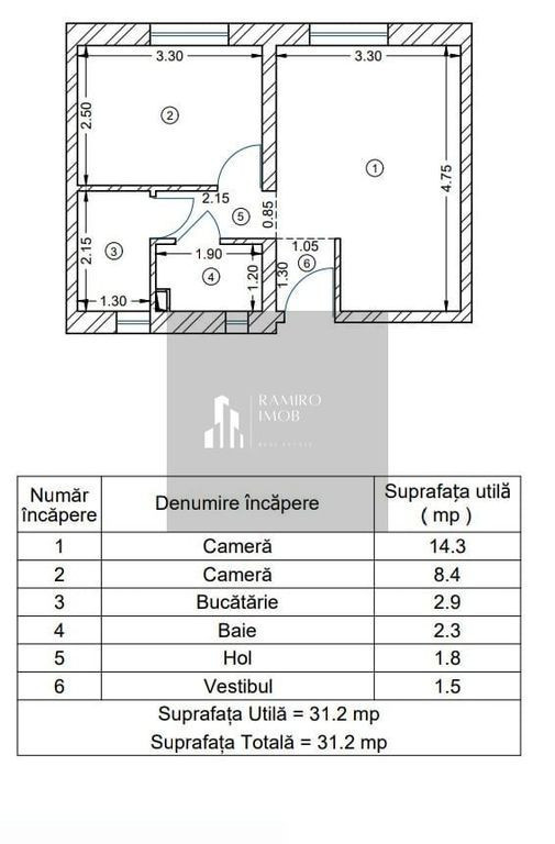 Ramiro Imob va ofera spre vanzare apartament doua camere Acces rapid la mijloacele de transport in comun Situat la etajul 1 din 4 Bloc anvelopat Suprafata 32 mp utili Mobilat si utilat Pret 59000 euro negociabil Pentru mai multe detalii, vizionări sau oferte similare, contactați-mă! Viorel 0763026362 Comision standard Oferim suport complet în relația cu banca, cu acces la cele mai bune oferte de finanțare, precum și asistență notarială la cele mai bune prețuri.