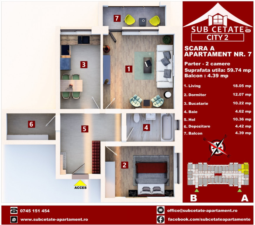 Subcetate Green Residence este localizat in N-E Brasovului, la o distanta de doar 3 km de oras, si este perfect racordat la infrastructura: plecand cu masina din complex in decurs de 1 minut ajungi la centura ocolitoare a Brasovului si intri direct in oras. Urmand in continuare ruta pe Strada 13 Decembrie, in 2 minute ajungi la punctul fierbinte al orasului: Coresi Mall, cel mai mare centru comercial al Transilvaniei. In zona imediat urmatoare, ai la indemana o multitudine de locatii: Patinoarul Olimpic, Paradisul Acvatic, Gara Brasov, Unirea Shopping Center, Bazinul Olimpic. Facilitatile unui oras contemporan si toate cele necesare vietii, iti sunt aproape: spitale si farmacii, biserici, scoli si gradinite, banci, magazine, cafenele sau pizzerii... Asadar cine va alege sa devina proprietar al unui imobil situat in noul cartier SUBCETATE GREEN RESIDENCE va avea la dispozitie toate facilitatile zonei :liniste si totodata departe de galagia urbana specifica si uratoarele facilitati: -contorizare individuala apa,energie electrica si energie termica; -obiecte sanitare baie; -racordare la toate utilitatile; -vopsea lavabila,faianta,gresie si parchet; -centrala proprie pe gaz si calorifere; -interfon,internet si cablu TV; -tamplarie ferestre din PVC cu geam termopan Va asteptam la vizionare pentru a va convinge de calitatea constructiilor si de excelentul raport pret / suprafata. Pentru orice alte informatii va stam la dispozitie. O zi buna va dorim.