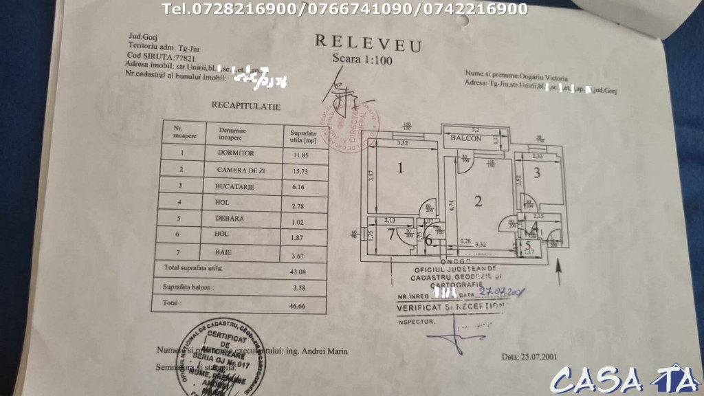 Agentia Imobiliara CASA TA ofera spre vanzare APARTAMENT 2 camere (47 mp), semidecomandat, situat pe Aleea Unirii etaj 3/4. Apartamentul este compus din: 2 camere,baie, bucatarie, balcon, hol. Dotari- Finisaje: Gresie, faianta, parchet, geamuri termopan. Utilitati: Apa curenta, gaze, curent electric, canalizare, incalzire-Centrala termica,Apometre, CATV, internet. Pret: 74.900 Euro Negociabil. Tel: 0728216900/ Alex Tataru (0766741090; 0742216900) Id intern: P1443
