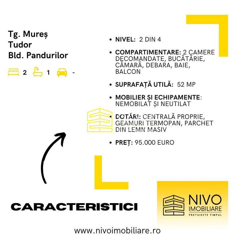 BV/341 Nivo Imobiliare vă propune spre vânzare acest apartament situat în Tg. Mureș, cartierul Tudor, Bld. Pandurilor. Apartamentul se află la etajul 2 din 4 şi este compus din 2 camere decomandate, bucătărie, cămară, debara, baie şi balcon având suprafața utilă de 52 mp. Este dotat cu centrală proprie, geamuri termopan și parchet din lemn masiv. Se vinde nemobilat și neutilat la prețul de 95.000 Euro. 0% comision pentru orice imobil cumpărat.