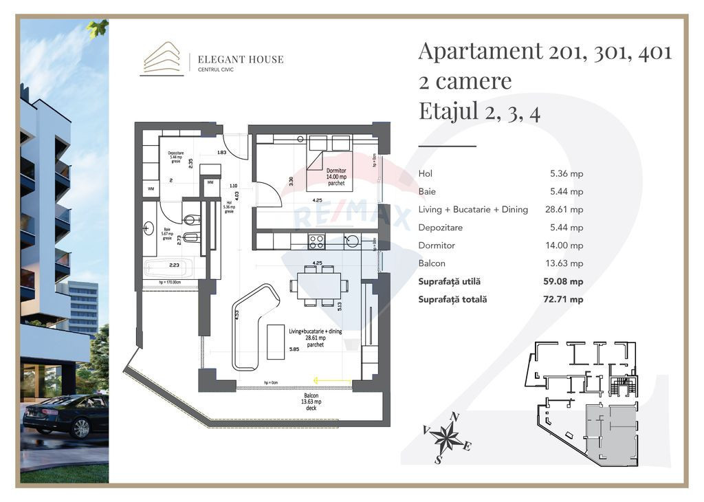 Cu o locație de excepție pe Bulevardul 15 Noiembrie nr. 71–73, Elegant House continuă să redefinească standardele locuirii urbane moderne în inima Centrului Civic al Brașovului. La doar câțiva pași de AFI Palace Brașov, acest apartament cu 2 camere oferă un stil de viață contemporan, în care confortul, designul inteligent și accesibilitatea se îmbină armonios. Situat la etajul 2, apartamentul de 2 camere combină eleganța cu funcționalitatea, fiind ideal atât pentru cupluri, cât și pentru investitori interesați de proiecte boutique cu randamente solide. Priveliștea spectaculoasă către Tâmpa adaugă o notă de liniște și inspirație, completând experiența unui cămin urban premium. Caracteristici și compartimentare: Suprafață utilă de 59 mp + terasă generoasă de 13 mp, perfect pentru momente de relaxare sau mic dejun în aer liber; Living open space cu bucătăria, conceput pentru a maximiza lumina naturală și fluxul spațiilor; Dormitor confortabil, ideal pentru odihnă sau amenajare ca birou; Baie modernă cu finisaje contemporane; Balcon cu priveliște către Tâmpa, oferind un cadru relaxant și intim; Înălțime liberă de 2,70 m, amplificând senzația de spațiu și confort. Finisaje și dotări Premium Centrală termică Vaillant cu control smart; Încălzire în pardoseală Rehau; Aer condiționat cu control inteligent; Video-interfon color; Sistem de alarmă și supraveghere video în zonele comune; Tâmplărie PVC Salamander; Parchet triplustratificat natural; Prize și întrerupătoare Gewiss, plus prize suplimentare în pardoseală, ideale pentru spațiu de lucru sau birou acasă. Fiecărui apartament îi este atribuit un loc de parcare în subsol, pe platforme hidraulice Klauss Parking, disponibil separat la 20.000 € + TVA. Cu poziționare ultracentrală, arhitectură contemporană și finisaje de calitate superioară, acest apartament de 2 camere de la Elegant House reprezintă o opțiune excelentă pentru cei care își doresc un cămin modern cu priveliște deosebită sau pentru investitori care caută un proiect premium și adaptabil, inclusiv pentru activități profesionale.