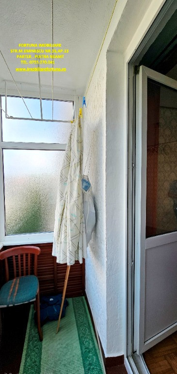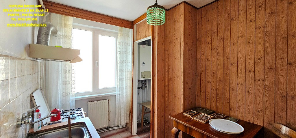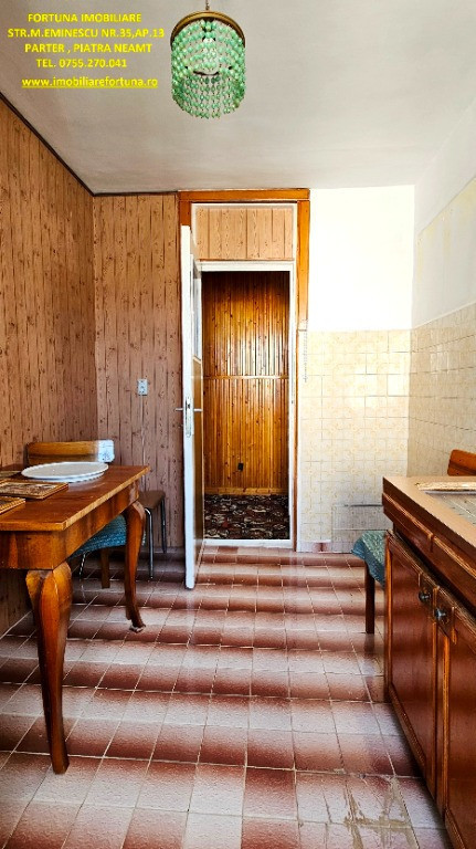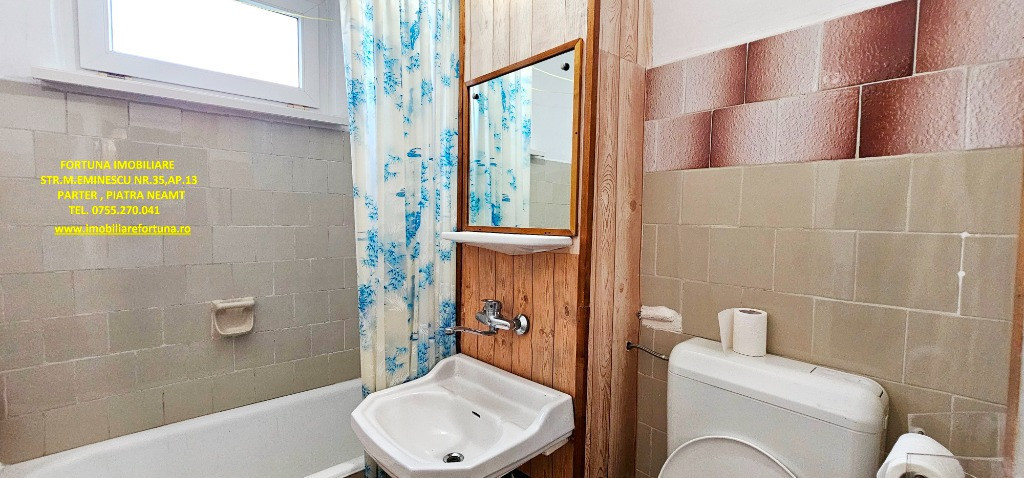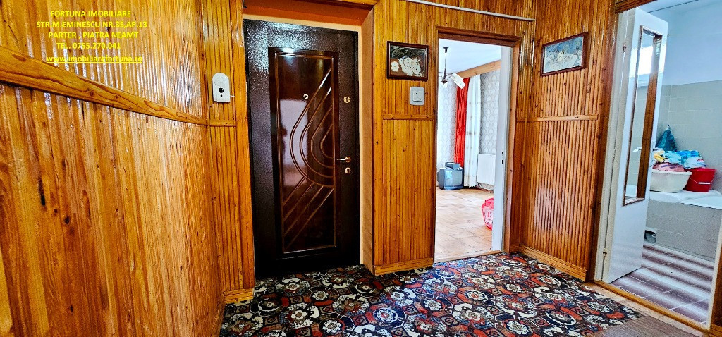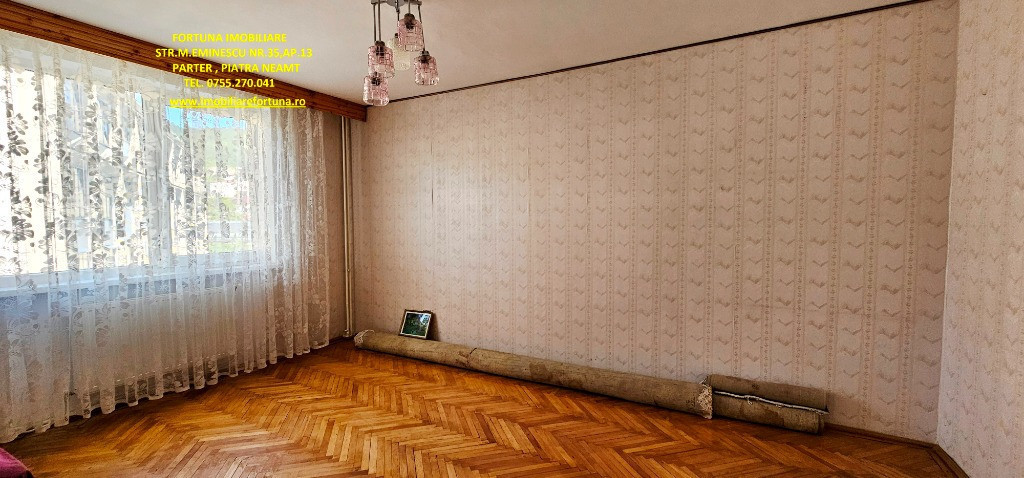APARTAMENT 2 CAMERE, ZONĂ CENTRALĂ – TRIBUNALUL VECHI, 63.500 EURO Dacă sunteți în căutarea unui imobil pentru locuit sau pentru o investiție imobiliară, FORTUNA IMOBILIARE vă supune atenției acest apartament cu 2 camere, cu o structură decomandată, amplasat la etajul 3 într-un bloc cu 4 etaje construit în anul 1981, din zona Centru - Tribunalul vechi. Apartamentul are orientare cardinală EST și poziționare pe mijloc, fiind luminos și călduros. Are suprafața utilă de 49,3 mp + balcon de 3,4 mp, suprafața totală de 52,7 mp, este prevăzut cu ușă antiefracție, acces controlat prin interfon, centrala termică, termopan. Este compus din hol generos, bucătărie, baie cu aerisire naturală, cameră de zi, dormitor și balcon generos, închis cu termopan. Se află la confluența principalelor obiective de interes din Municipiul Piatra Neamț (turistice, comerciale, culturale, educaționale, recreative, medicale etc). Preț 63.500 euro Pentru o prezentare detaliată a acestei oferte, furnizarea unor informații suplimentare referitoare la situația juridică / identificarea imobilului și programarea unei vizionări, vă invităm la sediul nostru, Fortuna Imobiliare, situat in Piatra Neamț, str. M. Eminescu, nr. 35, ap. 13, parter, jud. Neamț, lângă fostul Tribunal, tel. contact 0755.270.041. Your comfort is our priority ! Oferta noastră completă o găsiți aici: https://imobiliarefortuna.ro/