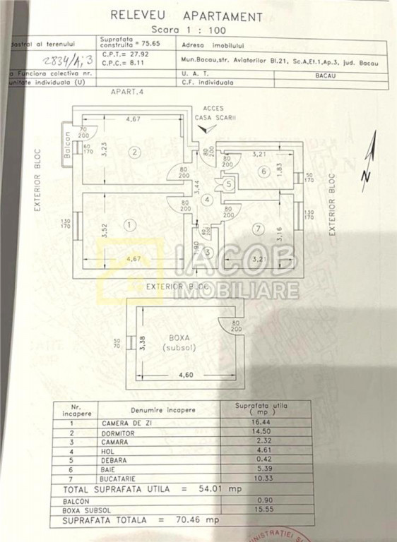 Apartament 2 camere decomandate ndash; Zona Aviatori (serviciul pasapoarte), Bacau Va propunem spre achizitie un apartament situat intr-o zon#259; linistita si accesibila din cartierul Aviatori, ideal atacirc;t pentru locuinta, cat si pentru investitie. Caracteristici locuinta: 2 camere spatioase, bine luminate Izolatie exterioara ndash; confort termic si costuri reduse de intretinere Centrala termica proprie Geamuri termopan si rulouri exterioare Compartimentare practica Depozitare suplimentara: Proprietatea beneficiaza de o boxa foarte generoasa, de 15.55 mp, perfecta pentru depozitare sau organizare eficienta. Avantaje: Costuri mici de intretinere datorita izolatiei si centralei termice Apartament cu posibilitatea de personalizare Boxa mare inclusa in pret Acces rapid la transport, magazine, scoala si alte facilitati Pentru detalii si vizionare: Sandu Iacob ndash; 0722.39.1234