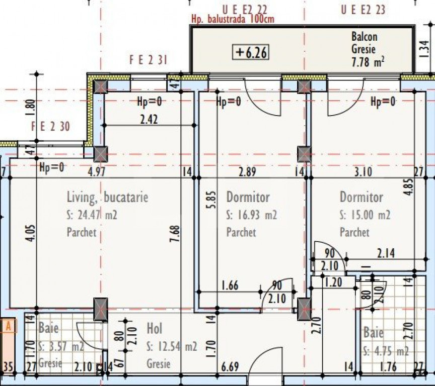 Apartament 3 camere, 2 bai, 77,26 mp, semifinisat, TVA inclu