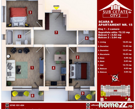 Cel mai mic pret apartament 3 camere, 72 mp utili, etaj 4