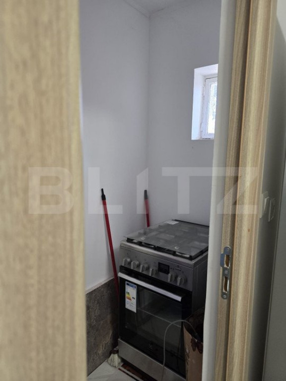 Bucătărie independentă, cu spațiu separat pentru gătit, perfect organizată.