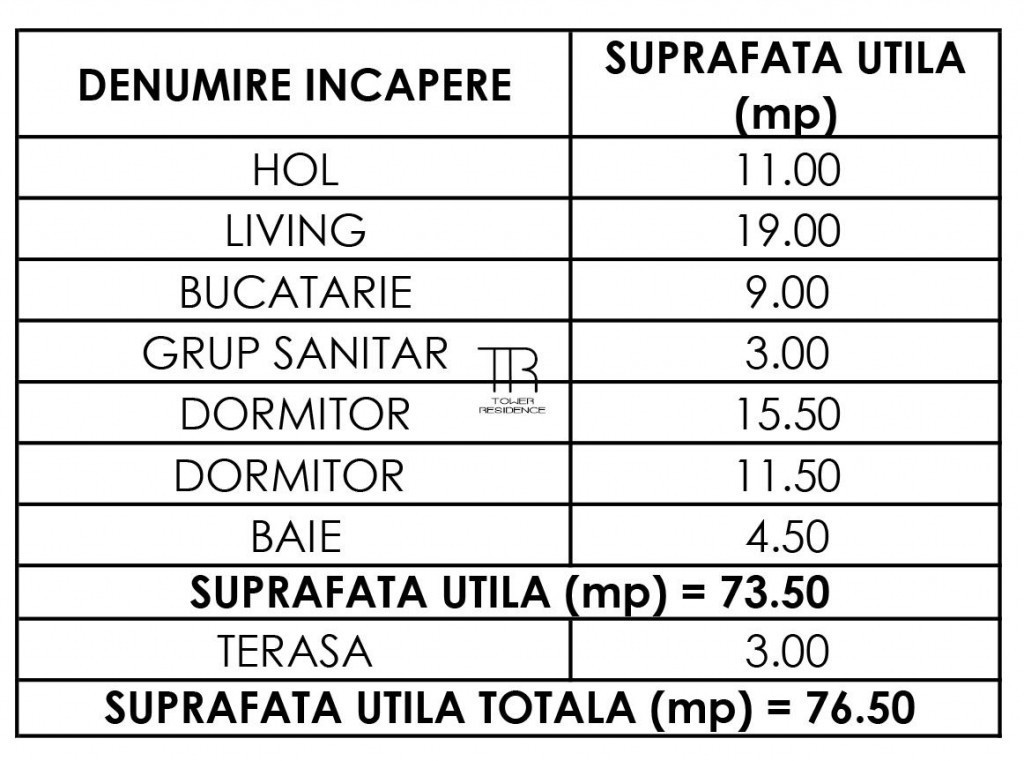 Birou de vanzari direct dezvoltator! COMISION 0% Termen finalizare Decembrie 2026 Noul complex Tower Residence, situat pe Soseaua Salaj nr 315-323 va ofera posibilitatea de a va alege caminul perfect. Datorita finisajelor de exceptie, atentia la detalii, calitatea materialelor folosite atat in constructie cat si in finisaje fac Tower Residence alegerea perfecta pentru noua dumneavoastra locuinta. Avem disponibile garsoniere si apartamente de 2 si 3 camere cu preturi incepan de la 77.400euro Apartamentul de 3 Camere de tip 3A are o suprafata utila totala de 76,50 mp. Facilitati: incalzire in pardoseala, finisaje la alegere de cea mai buna calitate. Fiecare bloc dispune de un spatiu separat tip lounge la intrarea in bloc si 2 lifturi. Disponibilitate: etajele 1-10 CONSILIERE CREDITE BANCARE privind achizitia locuintelor( simulari la toate institutiile financiare din Romania)=cost 0 client Programeaza acum o vizionare la telefon - 0751995504