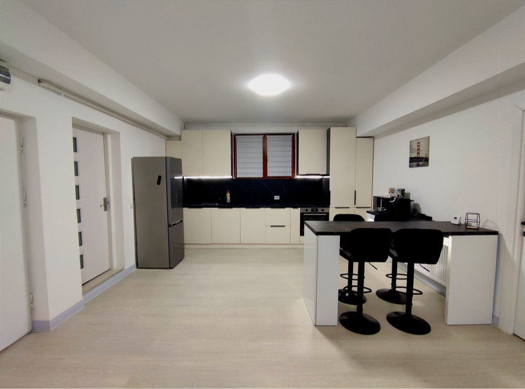 Apartament modern și luminos, complet renovat și amenajat pentru confort zilnic, situat la câteva minute de metrou. Spațiul este bine organizat și pregătit pentru prima închiriere. Dotări ale apartamentului • Bucătărie open space utilată cu plită, cuptor, cuptor cu microunde, frigider, mașină de spălat și espressor • Zonă de dining cu bar • Living mobilat, cu smart TV • Două dormitoare cu paturi duble și dressinguri • Ferestre mari, cu lumină naturală • Parcare disponibilă pe stradă Nivel • Apartamentul este situat la demisol înalt Localizare • Bucureștii Noi, zonă liniștită și verde • Acces rapid la metrou, supermarketuri, restaurante, cafenele, Parcul Bazilescu, școli și grădinițe • Acces facil către centru și ieșirea din București • Mall Colosseum și zona Băneasa la aproximativ 10–15 minute Preț • 760 € + utilități • Nu se percepe comision Mențiuni • Agenții imobiliari sunt rugați să contacteze doar cu client real pentru vizionare • Comisionul se respectă