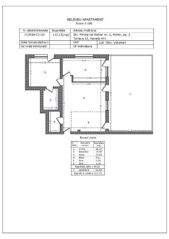 Descoperă confortul unui stil de viață modern în nordul Bucureștiului, într-un apartament deosebit situat în ansamblul rezidențial Pipera Loft 1, pe strada Mircea cel Bătrân nr. 2. Proprietatea este amplasată la parter și beneficiază de o compartimentare eficientă, ideală pentru o familie sau pentru investiție. Suprafața utilă interioară este de 65.23 mp, la care se adaugă o terasă generoasă cu grădină proprie de 46.90 mp, rezultând o suprafață totală de 112.13 mp. Apartamentul este compus din living luminos de 21.37 mp, două dormitoare confortabile de 13.57 mp și 12.93 mp, un al treilea dormitor/birou de 9.61 mp, două băi moderne de 4.39 mp și 3.36 mp, precum și acces direct către terasa cu grădină, perfectă pentru relaxare sau timp petrecut în familie. Locuința se predă finisată la cheie, cu materiale de calitate, fiind pregătită pentru mutare imediată. Toate actele sunt finalizate, ceea ce permite o tranzacție rapidă. Pipera Loft 1 este un proiect rezidențial boutique, cu un număr redus de apartamente, conceput pentru a oferi intimitate, confort și acces facil către principalele puncte de interes din zona de nord a capitalei. Zona Pipera este una dintre cele mai dinamice și căutate zone din București, oferind acces rapid către centre de business importante, precum Dimitrie Pompeiu, dar și către școli internaționale, grădinițe, restaurante, cafenele și centre comerciale. În apropiere se regăsesc Promenada Mall, Pipera Plaza, precum și multiple supermarketuri și facilități pentru viața de zi cu zi. Accesul către mijloacele de transport și principalele artere rutiere este facil, asigurând conexiuni rapide cu restul orașului. Acesta este ultimul apartament disponibil în proiectul Pipera Loft 1. Achiziția se face direct de la dezvoltator, fără comision, fără costuri ascunse. Pentru cei interesați de investiții viitoare, dezvoltatorul are în desfășurare și proiectul Pipera Loft 2, situat pe Bulevardul Pipera nr. 42, cu termen de finalizare estimat pentru sfârșitul anului 2026. Apartamentele disponibile pot fi consultate pe site-ul oficial: piperaloft.ro. Pentru mai multe detalii sau programarea unei vizionări, vă stăm la dispoziție.