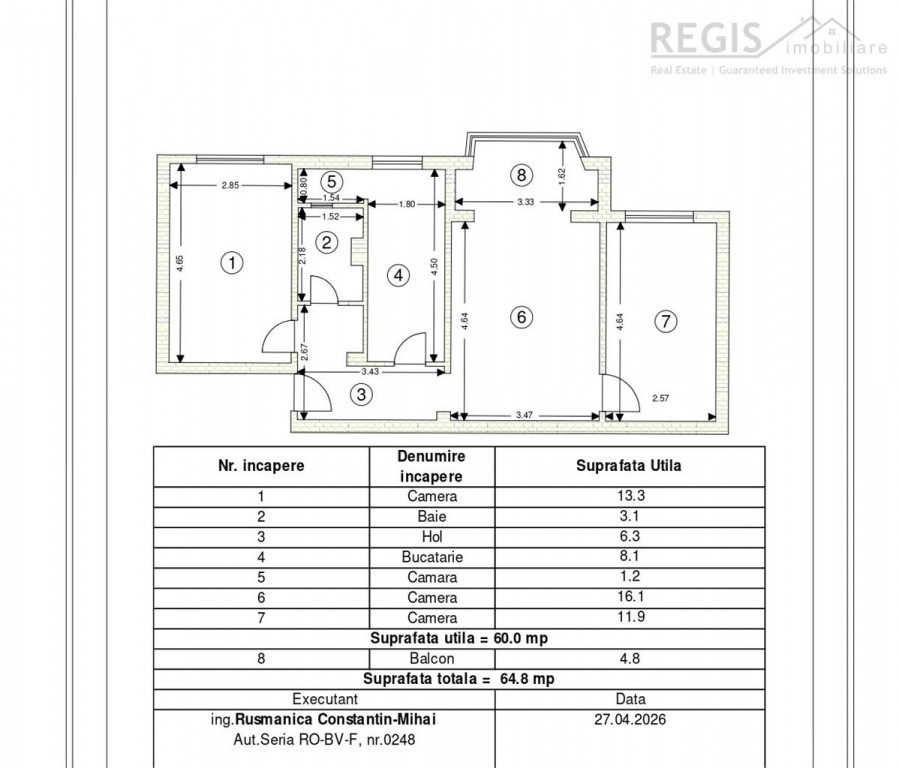 - Suprafata apartament: 64,8 mp