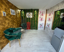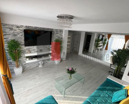 Sufrageria este conturată de câteva detalii: piatră decorativă, oglindă, șemineu electric, canapea, masă cafea de sticlă, tv Samsung smart, birou ce poate fi folosit și ca masă pentru 10 persoane. Al doilea dormitor este dotat cu pat, dressing, comodă, tv smart.