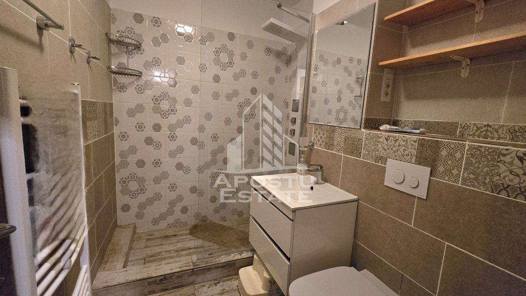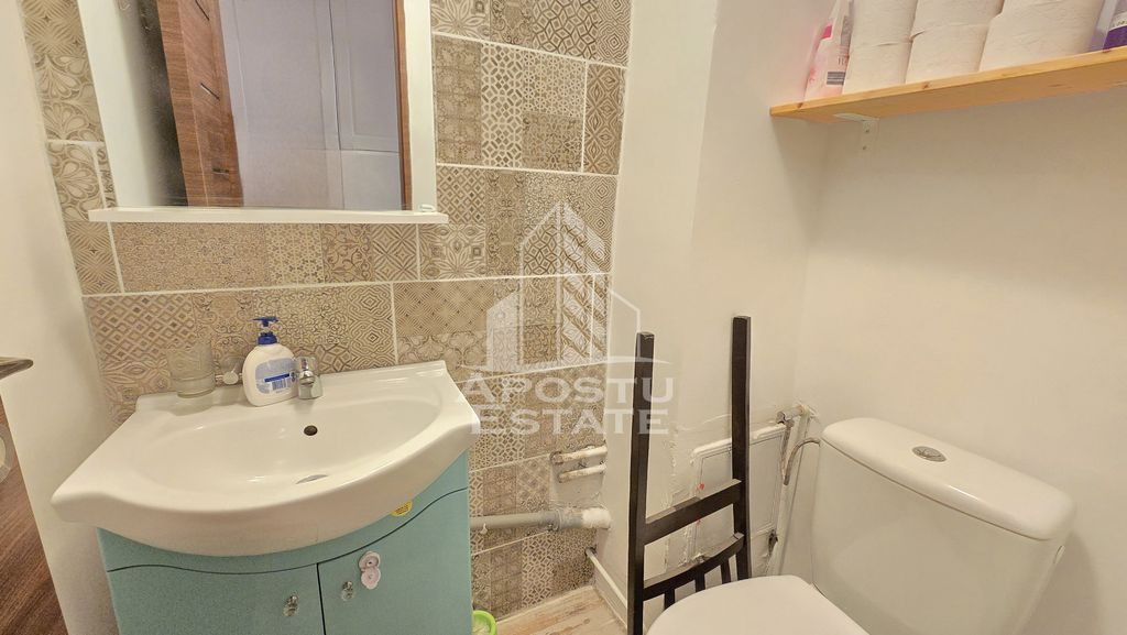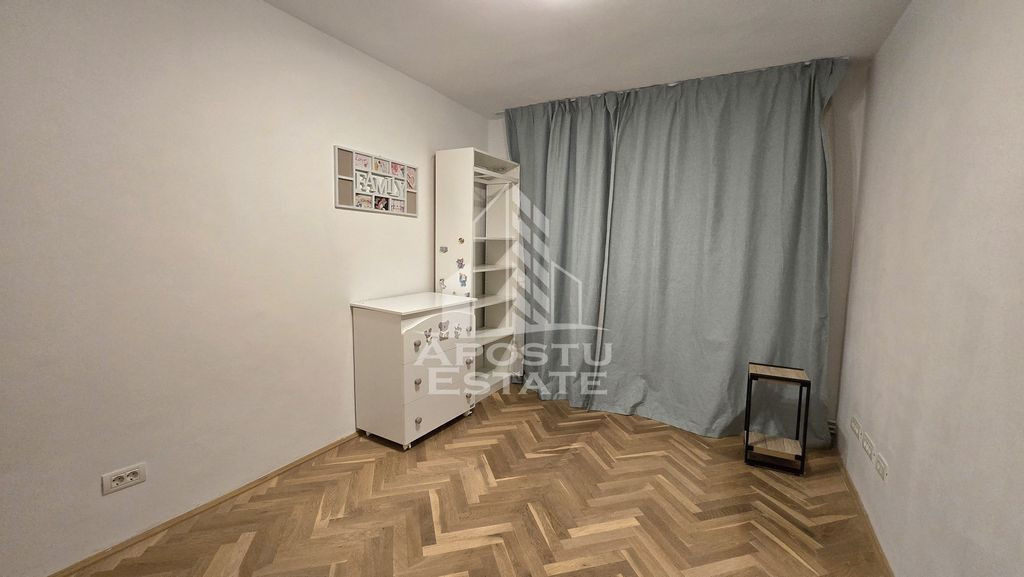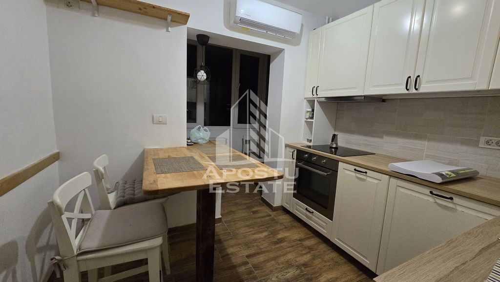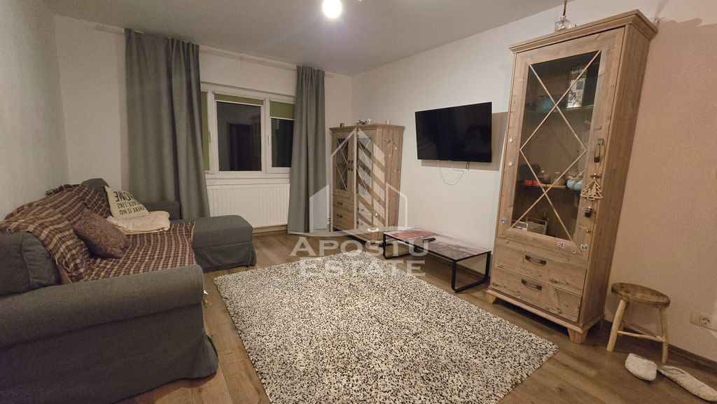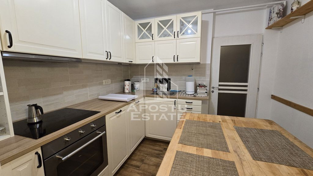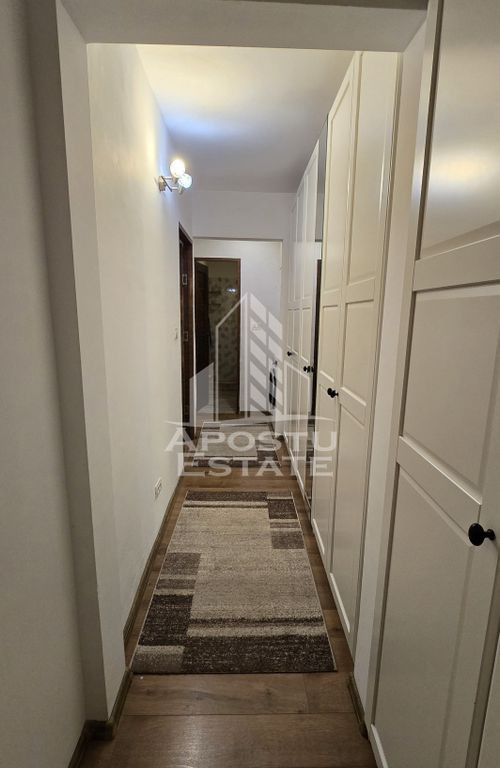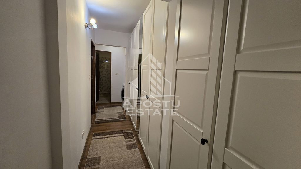 APOSTU ESTATE va ofera spre inchiriere un apartament cu 3 camere si 2 bai, complet renovat, situat in zona Torontalului. Zona este linistita, apartamentul aflandu-se la cateva minute fata de parc, market, statie de autobuz sau fata de scoala. Apartamentul este situat la etajul 2 din 4 al unui bloc ce este izolat exterior, are o suprafata utila de 66 mp, este decomandat si compartimentat astfel: - hol de acces - living spatios - bucatarie mobilata si utilata cu balcon - hol principal cu dressing spatios pe comanda - baie de serviciu - dormitor mic ( la alegere o sa fie mobilat cu birou si scaun sau cu o canapea extensibila ) - baie principala prevazuta cu dus - dormitor matrimonial Confortul termic este realizat prin centrala proprie, dar si prin intermediul aparatului de aer conditionat. Apartamentul este disponibil incepand cu 8 decembrie. Disponibil imediat! Va asteptam cu drag la o vizionare chiar astazi!