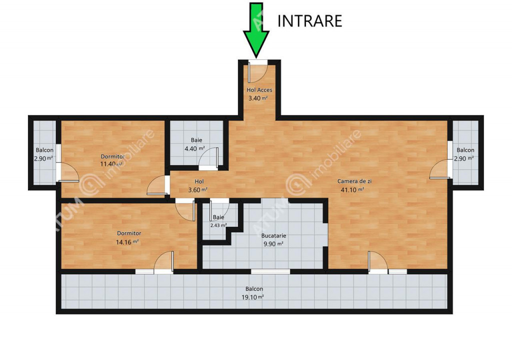 Comision 0 la achizitie ! Atum Imobiliarea va recomanda spre achizitie apartament de 3 camere decomandate cu 2 bai si 3 balcoane, pozitionat la etajul intermediar 1, localizat in Sibiu zona Rahovei. Locuinta face parte dintr-un complex de apartamente alcatuit din 2 imobile cu regimul de inaltime Parter 11 Etaje edificate in anul 2022 pe structura de cadre din beton armat cu grinzi din beton armat si zidarie de 30 cm. Imobilul din care face parte locuinta beneficiaza de 2 lifturi marca Schindler, izolatie termica exterioara acoperita cu vopsea decorativa siliconata, interfon pentru accesul securizat si acoperis terasat. Apartamentul are 92 mp utili si este compus din camera de zi cu locul de luat masa care insumeaza 41.40 mp, bucataria cu camara de 10.70 mp, 2 dormitoare dintre care cel matrimonial de 14.60 mp iar cel al copilului sau dedicat oaspetilor de 11.40 mp, 2 bai dintre care cea principala prevazuta pentru cada de 4.10 mp iar toaleta de serviciu de 2.40 mp si un hol de acces de 3.40 mp unde poate fi pozitionat cuierul cu pantofar. Separat de suprafata utila a apartamentului amintim si cele 2 balcoane care au cate 2.90 mp si o terasa tip logie de 19.10 mp. Spatiile comune interioare sunt complet finisate, casa scarii este generoasa, dispune de doua ascensoare electrice de ultima generatie cu functionare silentioasa, acces securizat, scarii placate cu granit, mana curenta din teava rectangulara, plafoniere cu senzori de miscare si zugraveli in lavabila alba Imobilul dispune de locuri proprii de parcare supraterane si subterane. Locuinta este finisata la stadiul de alb si include: - Usa metalica antiefractie de acces placata cu panou MDF marca Porta-Doors; - Tamplarie PVC cu geam termopan LOW-E, glafuri interioare si exterioare; - Instalatie termica cu centrala pe imobil, calorifere de otel termostatate montate pe pozitie, repartitor/distribuitori si tevi multristrat PEX-AL-PE - Pereti interiori tencuiti ( tencuiala pe baza de var-ciment ), gletuiti si zugraviti in lavabila alba; - Sape de egalizare elicopterizate; - Interfon functional; - Instalatii electrice cu tablou general individual si sigurante pentru consumatorii de putere, doze, dulii, prize si intrerupatoare montate marca Schneider Sedna, instalatii pentru curenti slabi ( TV, Telefon, Internet ) inclusiv prize montate; - Racorduri apa-canal in baie si bucatarie; - Contorizari individuale si contoare montate pentru Gaz, Curent si Apa; - Balcon inchis cu parapet din teava rectangulara si placat cu gresie antiderapanta de exterior; Optional apartamentul se poate preda la stadiul de cheie cu gresie si faianta icirc;n bucatarie, gresie si faianta icirc;n bai, obiecte sanitare ( cabina de dus/cada, lavoar, vas wc, baterii cada/lavoar ), parchet laminat, usi de interior marca Porta Doors, corpuri de iluminat intr-un buget prestabilit. Valoarea de achizitie a locuintei la stadiul de alb este de 157.000 euro, aceasta se poate achizitiona si prin accesarea unui credit bancar ID intern: 1963.