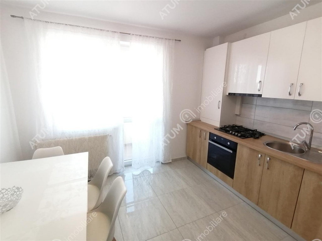 Apartament de inchiriat cu 3 camere decomandate, balcon si loc propriu de parcare, zona Calea Cisnadiei din Sibiu. Suprafata utila a locuintei este de 83 mp compartimentata astfel: hol la intrare din care se face accesul in bucatarie, dormitor, baie cu cada si geam de aerisire, living din care se face accesul la nivelul superior unde se aflta inca un dormitor. Separat mai detine un balcon de 7 mp cu acces din dormitor si bucatarie. Apartamentul dispune de usa de acces din metal, usi interioare din lemn, gresie, parchet laminat, faianta, tamplarie PVC cu geamuri termopan, centrala proprie pe gaz si calorifere din otel. Locuinta este complet mobilata si utilata cu frigider, cuptor electric, plita pe gaz, hota, masina de spalat rufe, masina de spalat vase. Valoarea de inchiriere este de 470 euro/luna o garantie. ID intern: 3149.