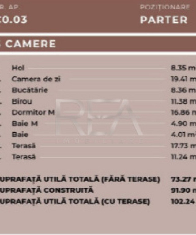 REA Imobiliare va prezinta un apartament de 3 camere in zona Ferdinand, decomadat, in proces de finalizare, etaj p/7. Sistem de incalzire -> incalzire in pardoseala. Suprafata totala 102,24 mp din care suprafata utila de 73,27 mp, suprafata terase 28,97 mp. Configuratie: dormitor, birou, 2 bai , living + bucatarie, 2 terase. Transport in comun -> 1 min pana la statie STB Oborul Nou, 2 min pana la statia STB Horei, 7 min pana la statia de metrou Iancului si 20 min pana la statia de metoru Universitate. Pentru detalii si vizionari va rugam sa ne contactati specificand codul de identificare P10711. Id intern: P10711