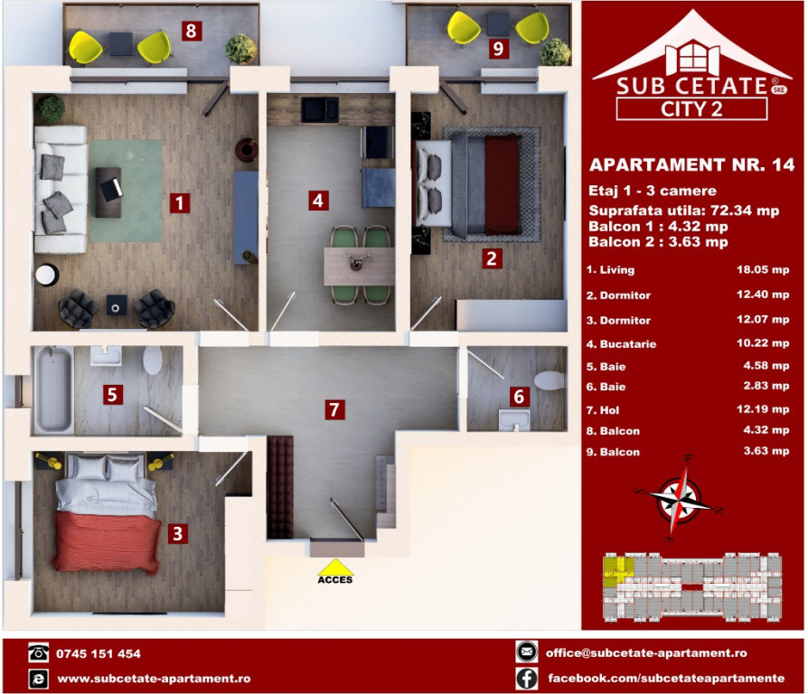 Subcetate Green Residence complex rezidential cu peste 1.000 de apartamente, de 1, 2 si 3 camere, destinate tuturor categoriilor de varsta.Locatia este o zona adiacenta a Brasovului, la 3 minute de complexul comercial CORESI in vecinatatea unui cartier de vile, functional si la aproximativ 5-10 minute de centrul Brasovului. Complexul este construit pe malul unei ape curgatoare, iar panorama deosebita a muntilor care va incanta privirea noilor proprietari este unul din atu-urile noastre. Pe langa integrarea perfecta in zona, complexul rezidentual beneficiaza de toate facilitatile, utilitatile, inclusiv spatii comerciale in incinta,locuri de joaca pentru copii,spatii verzi si zona de relaxare. In aceasta zona a orasului am construit peste 53 vile si alte 4 vile moderne care sunt in faza de constructie vor indeplini toate standardele de calitate si siguranta. Cartierul se afla la mica distanta de noul centru comercial Coresi Shopping Center care este realizat de Immochan, divizia de Real Estate a grupului francez Auchan si cuprinde un hipermarket Auchan de 16. 000 mp - cel mai mare din Transilvania, un centru comercial de 25. 000 mp inchiriabili si o parcare de 3. 000 de locuri. Asadar cine va alege sa devina proprietar al unui imobil situat in noul cartier SUBCETATE GREEN RESIDENCE va avea la dispozitie toate facilitatile zonei :liniste si totodata departe de galagia urbana specifica si uratoarele facilitati: -contorizare individuala apa,energie electrica si energie termica; -obiecte sanitare baie; -racordare la toate utilitatile; -vopsea lavabila,faianta,gresie si parchet; -centrala proprie pe gaz si calorifere; -interfon,intrenet si cablu TV; -tamplarie ferestre din PVC cu geam termopan 5 camere; Va asteptam la vizionare pentru a va convinge de calitatea constructiilor si de excelentul raport pret / suprafata. Pentru orice alte informatii va stam la dispozitie. O zi buna va dorim.