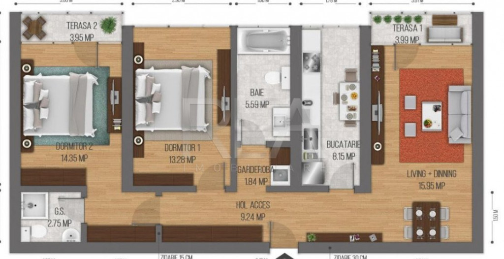 R.E.A. Imobiliare Apartament cu 3 camere, situat la etajul 10/10+E tehnic, intr-un imobil finalizat in 2018, suprafata totala de 79,09 mp, din care suprafata utila 71,15 mp, balcon 7,94 mp. Configuratie: 2 dormitoare , living, bucatarie, 2 bai si 2 balcoane. Sistem incalzire: centrala proprie. Finisaje premium incluse, marmura Ruschita in hol, living, bai, parchet triplustratificat stejar 12mm in dormitoare. Apartamentul este dotat cu rulouri electrice pe telecomanda in dormitoare si living, aparat de aer conditionat multi split cu 3 unitati interioare, spoturi led dimabile, usi MDF semilucioase cu broasca magnetica si balamale ascunse. Accesorii in ambele bai GROHE (suport prosoape, cuier halat, suport sapun, suport periute dinti, perie toaleta, set dus cu baterie cu termostat), Bideu, lavoare, vas WC cu functie bideu IdeaStandard, videointerfon, unitate centrala de aspirat (se monteaza in perete si astfel se va muta doar furtunul de aspirat in fiecare camera, fiind conectat la prize speciale), Complex supravegheat video. Acces camere si bariera intrare din aplicatie, 2 lifturi. Loc de parcare inclus in pret. Blocul este racordat la toate utilitatile. Ambient linistit, proximitate de Militari Shopping Center, Ballrom Militari Residence, Lidl, Decathlon, Dacia Meridian Vest, Restaurant Vulturul. Parcare la liber. Acces la transportul în comun-> 3 minute pana la statiile STB. Pentru detalii si vizionari, va rugam să ne contactați, specificand codul de identificare P6430. Id intern: P6430