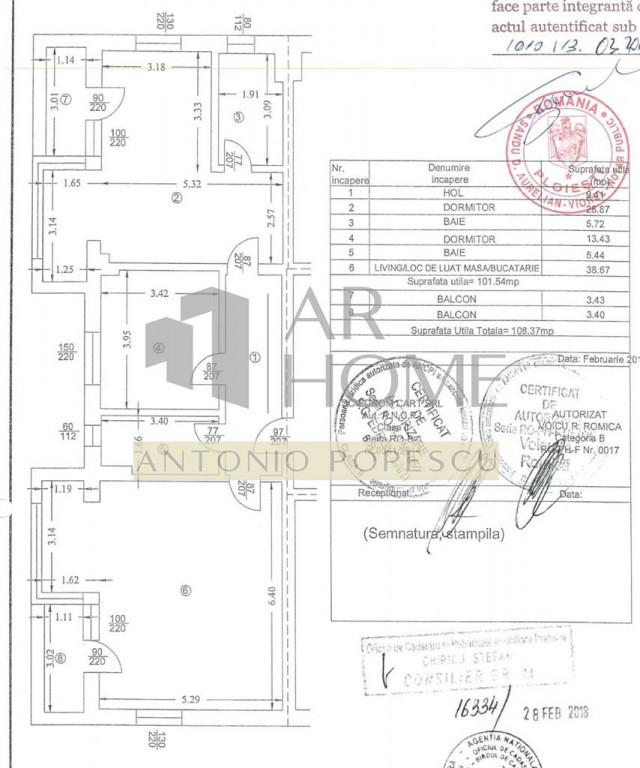 Vanzare apartament 3 camere, decomandat, in Ploiesti, zona centrala (str. Romana), situat la etajul 6 intr- un bloc cu regimul de inaltime S P 8. Imobilul face parte din ansamblul rezidential Romana Residence, construit in anul 2018, pe cadre de beton, peretii din caramida Porotherm, izolat termic la exterior cu polistiren de 10 cm si la interior cu vata minerala si rigips. Ansamblul este alcatuit din 2 blocuri imprejmuite cu gard si acces prin porti actionate electric si paza umana 24/24h, avand ca vecinatati Colegiul National Ion Luca Caragiale, Halele Centrale, Mega Image, mijloace de transport in comun etc. Apartamentul are o suprafata utila de 101,54 mp plus doua balcoane in suprafata utila de 6,83 mp. Dotari: loc de parcare propriu suprateran, boxa proprie in subsolul blocului, adapost ALA, 2 lifturi, usa intrare metalica Pinum blindata, usi interioare celulare MDF (Pinum), centrala termica proprie, calorifere din aluminiu si otel, tamplarie PVC Salamander cu geamuri securizate, ceramica import Italia, obiecte sanitare IMOLA, parchet din lemn stratificat in living si parchet laminat in dormitoare, vopsea lavabila, tapet etc. Se vinde complet mobilat si utilat cu mobilier din MDF Rovere si Mobexpert, dotat cu aparat aer conditionat in fiecare camera, Smart TV, plita pe inductie, cuptor electric, hota, cuptor cu microunde, masina de spalat vase/ rufe etc. Pret: 229000 euro.